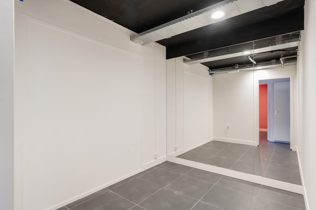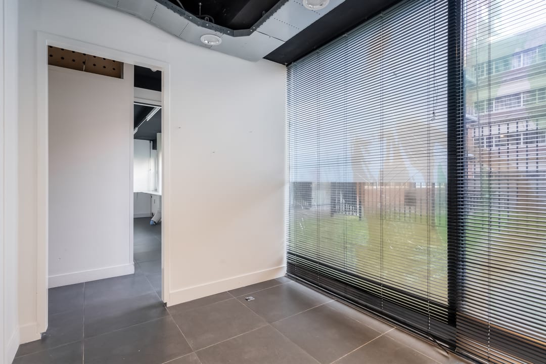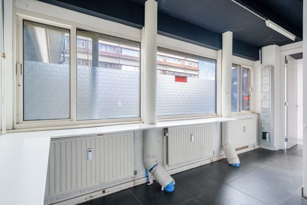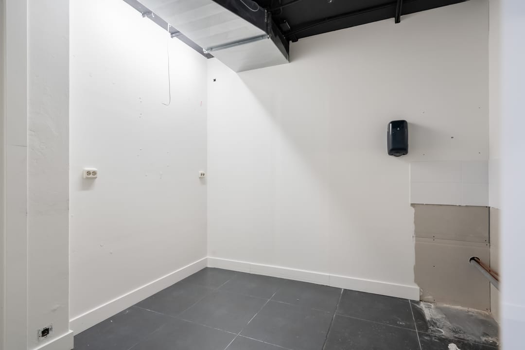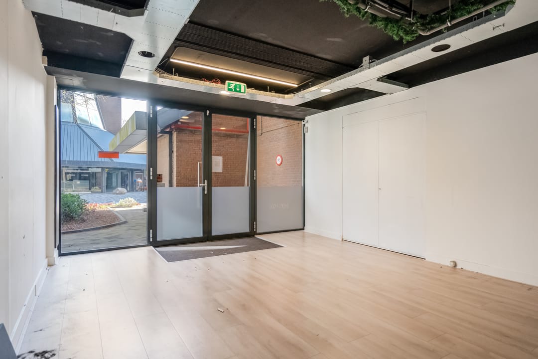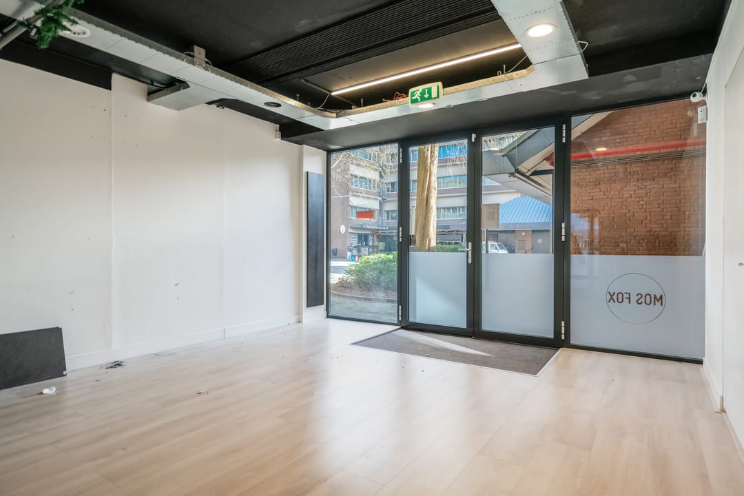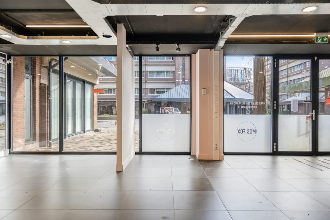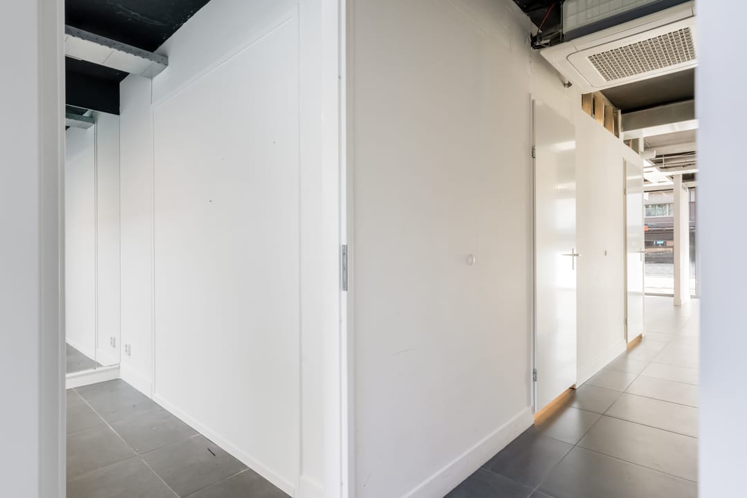 De voorzijde van de ruimte bestaat volledig uit grote raampartijen die reiken van de vloer tot aan het plafond. Dit zorgt voor veel lichtinval in de ruimte en zichtbaarheid vanaf de straat.