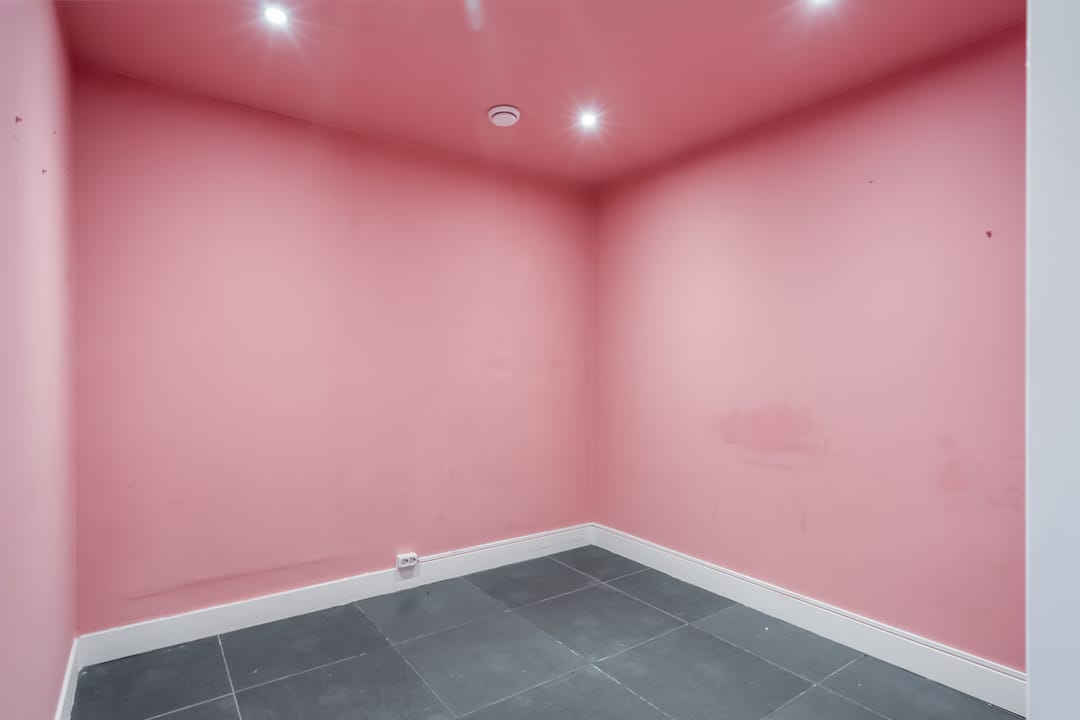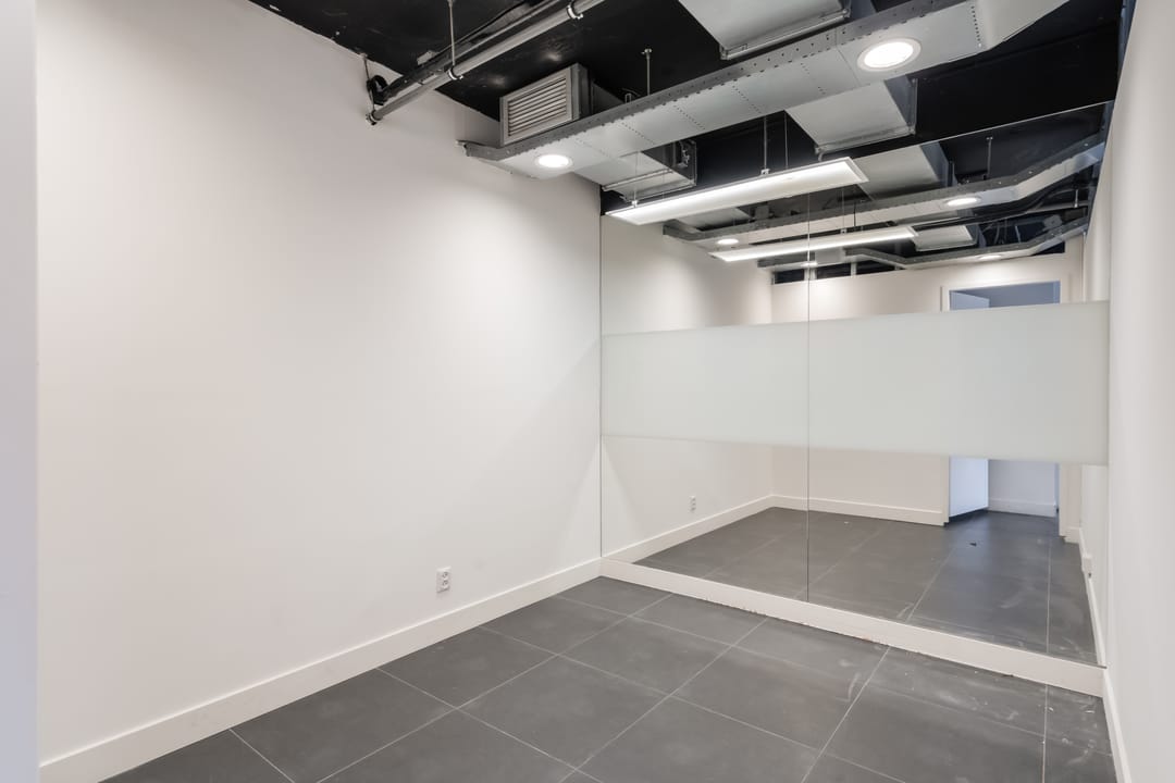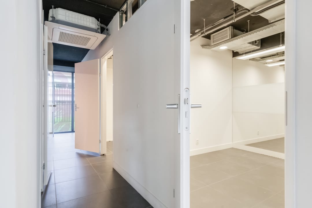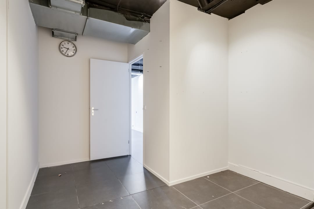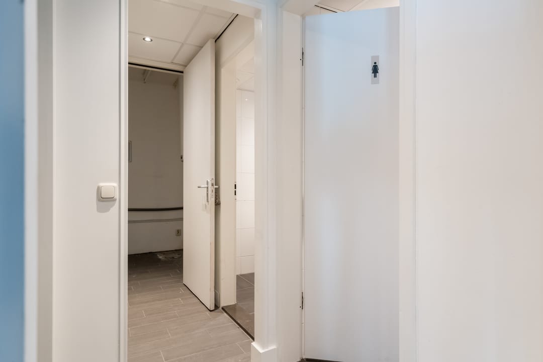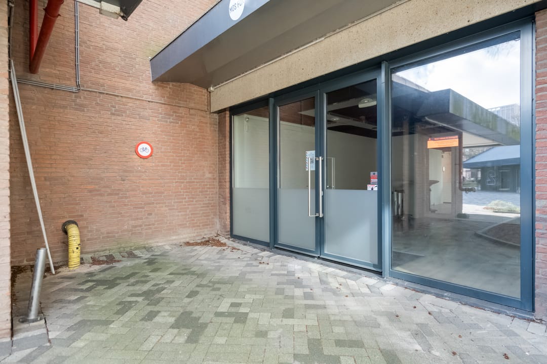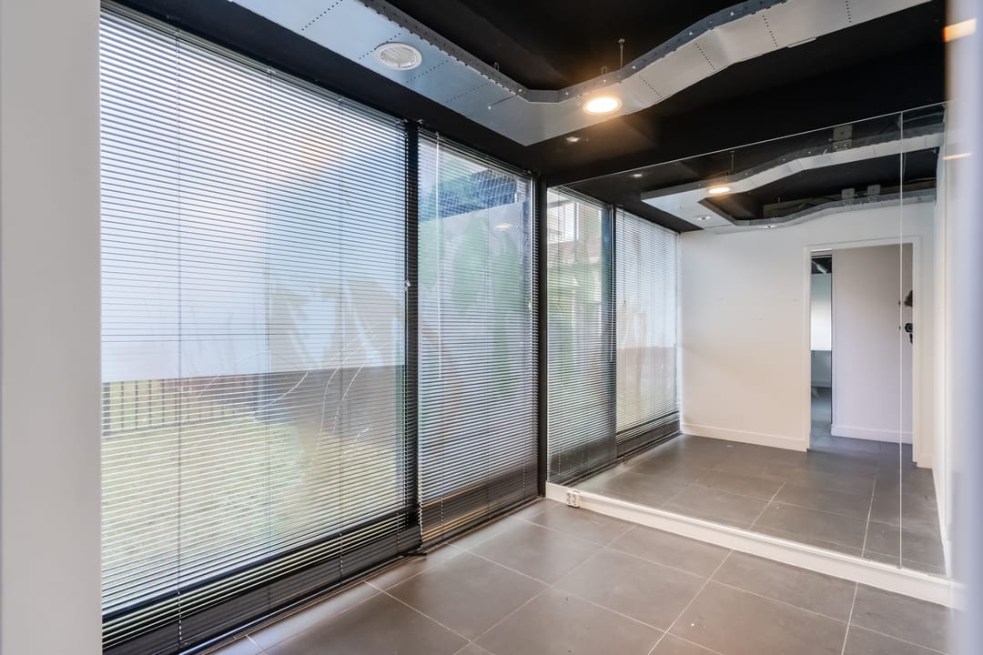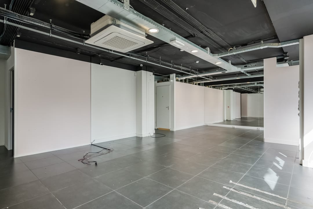 De voorzijde van de ruimte bestaat volledig uit grote raampartijen die reiken van de vloer tot aan het plafond. Dit zorgt voor veel lichtinval in de ruimte en zichtbaarheid vanaf de straat.