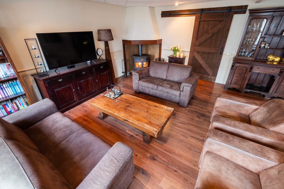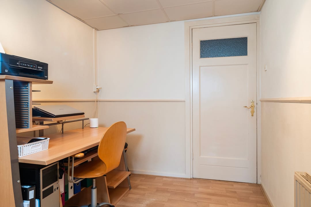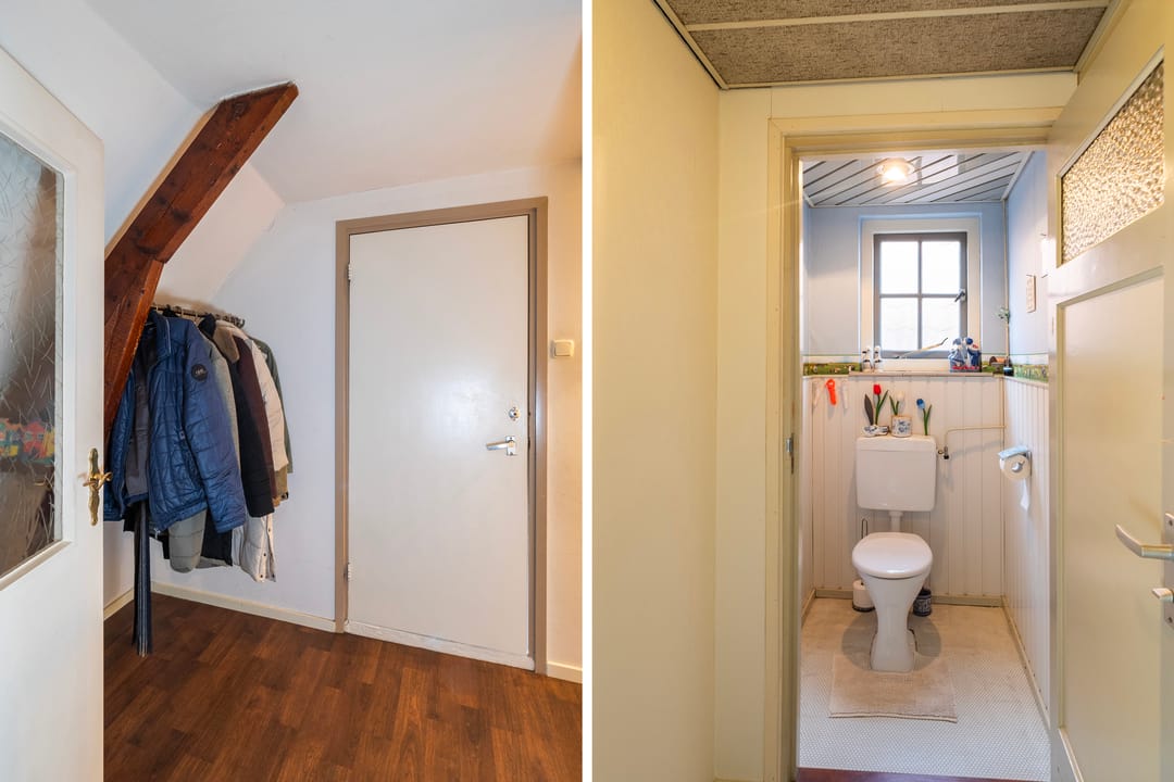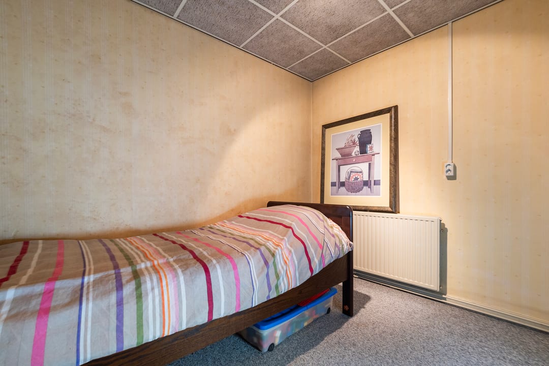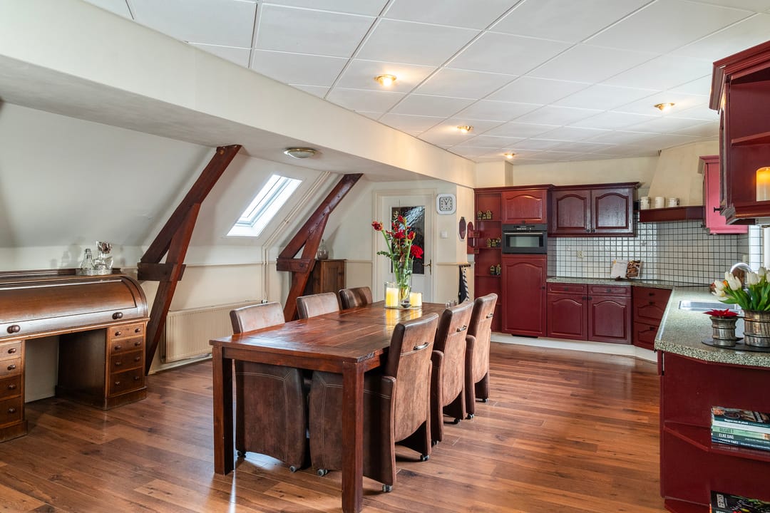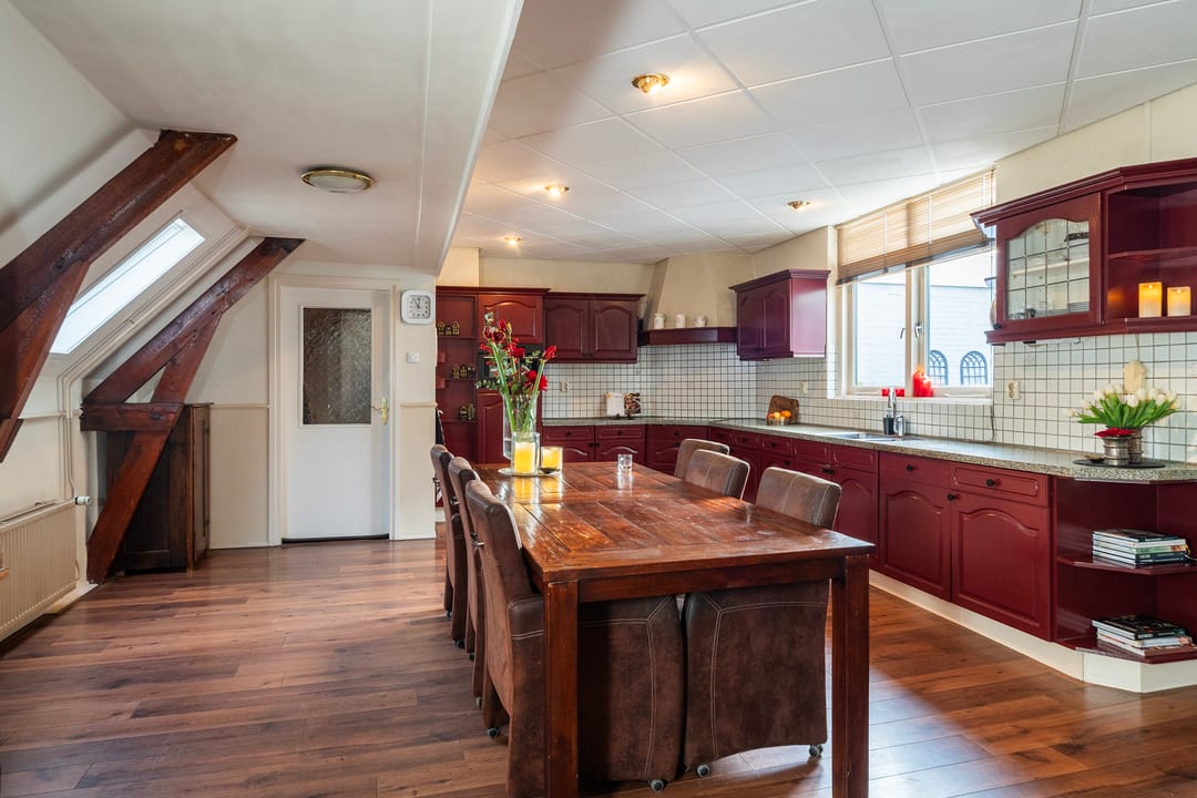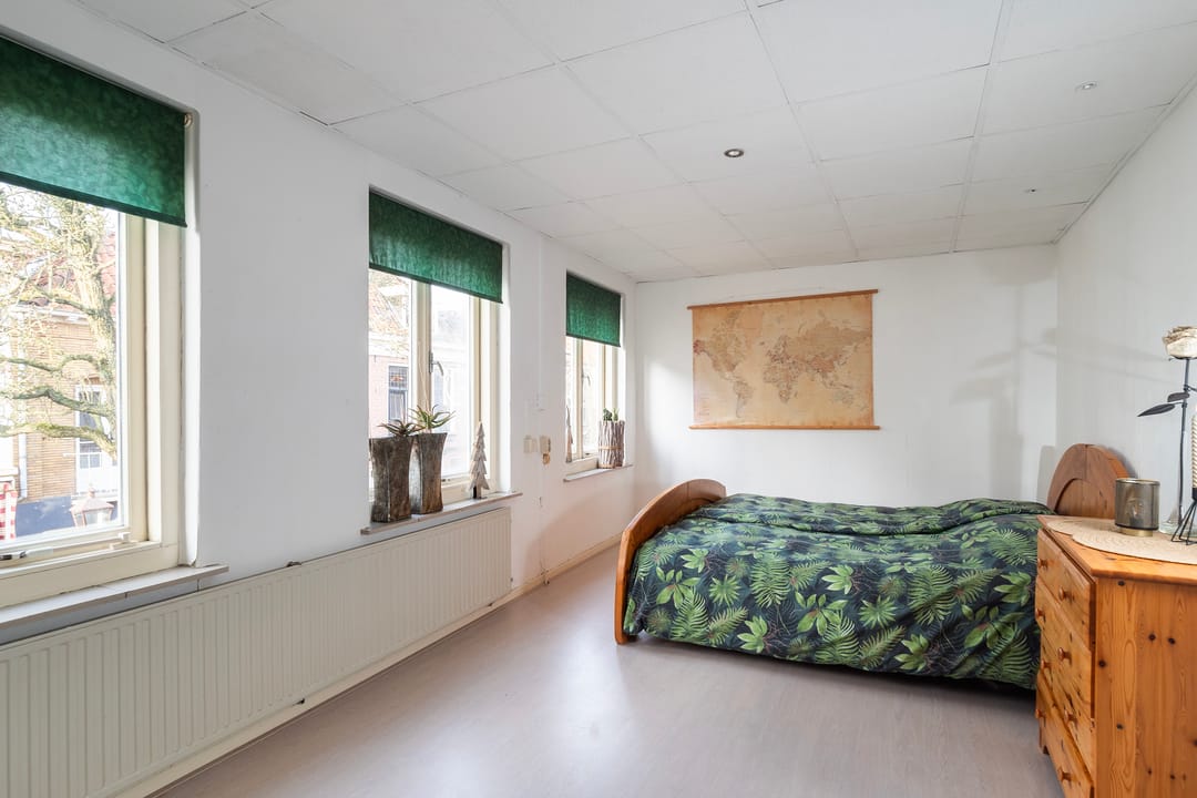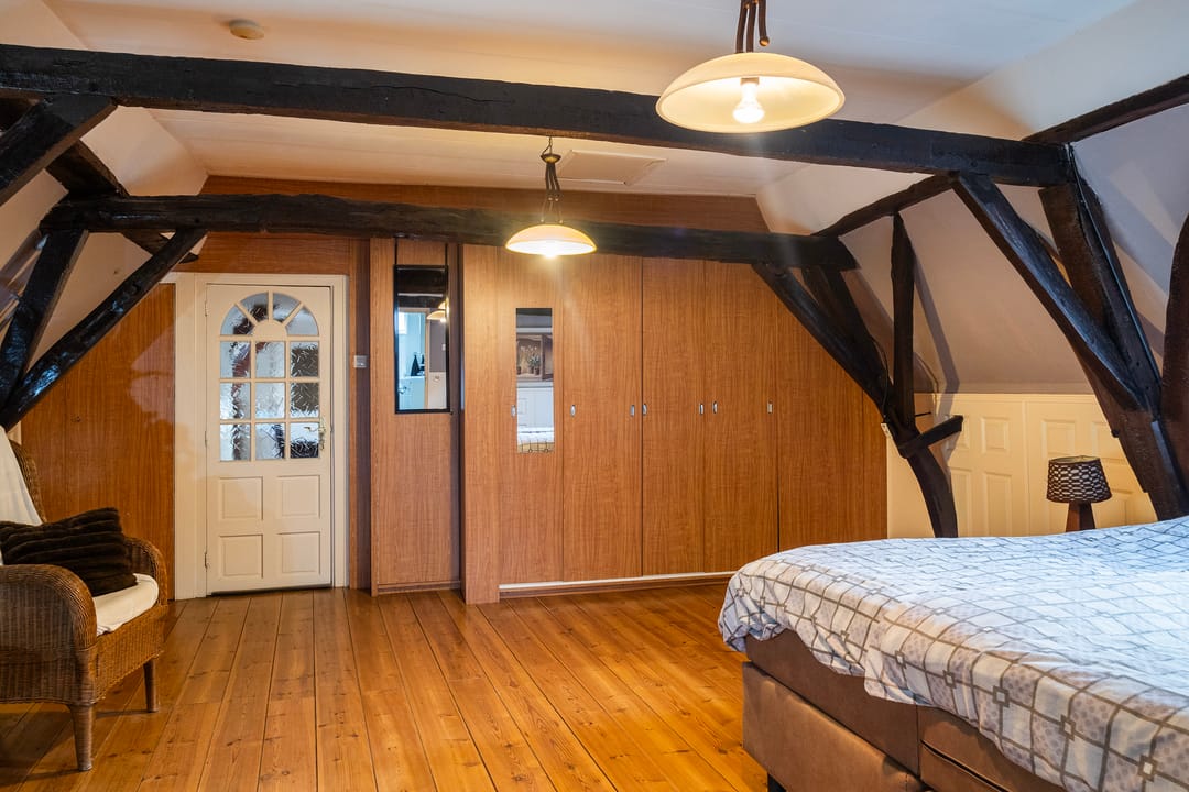 De bovenwoning telt drie slaapkamers, stuk voor stuk prettig van formaat. De masterbedroom steelt de show met zicht op de karakteristieke houten dakbalken en een praktische kastenwand. Hier word je wakker met het zachte ochtendlicht en het gevoel dat je in iets bijzonders woont. Rustig, warm en helemaal eigen.