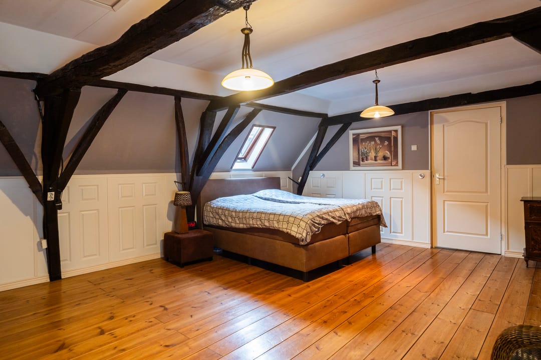 - Drie slaapkamers, waaronder een masterbedroom met karakteristieke houten dakbalken en kastenwand