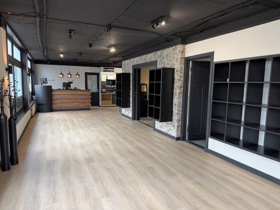 Verkoopruimte/showroom met fraaie pvc-vloer, kantoor, verblijfsruimte met pantry, kelder/opslag en toiletruimte.