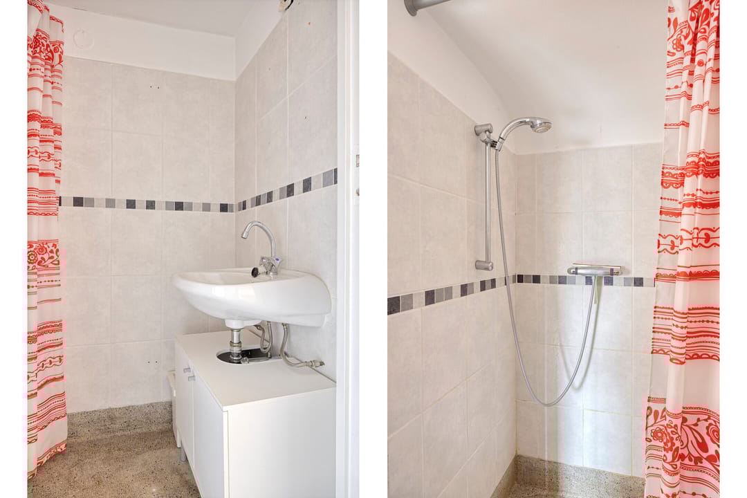 Badkamer voorzien van een inloopdouche en een vaste wastafel, afgewerkt met een granitovloer, tegelwerk wanden en een stucwerk plafond.