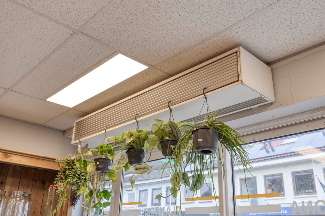 Begane grond vloer is afgewerkt met natuurstenen vloer (travertin), stucwerk wanden en een systeemplafond met tl-verlichting. Verwarming geschiedt d.m.v. radiatoren en een warmtegordijn. Koeling d.m.v. airconditioning.