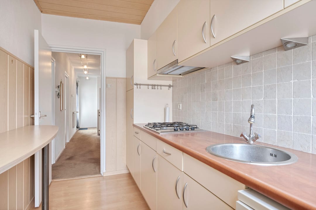 Woonkamer (doorzon), met laminaatvloer, stucwerk wanden en een stucwerk plafond. Keuken met eenvoudige keukeninrichting, laminaatvloer, stucwerk wanden met lambrisering en een schrotenplafond. Separaat toegankelijk toilet met tegelvloer, gedeeltelijk tegelwerkwanden en een schrotenplafond.