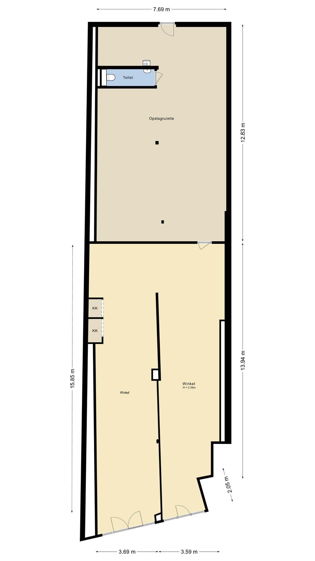 Het pand meet kent een totale netto oppervlakte van circa 214 m2, waaronder circa 105 m2 vloeroppervlak in de winkel, wat in de huidige situatie thans is opgedeeld in 2 winkels (circa 50 en 55 m2 per winkel) met gedeeld magazijn (circa 95 m2). Deze ruimte en de huidige indeling maakt het mogelijk de helft van de winkel te exploiteren en bijvoorbeeld de andere helft onder te verhuren, of om met twee ondernemers het pand te betrekken. Het is natuurlijk ook mogelijk de winkel weer als één ruimte te betrekken.
