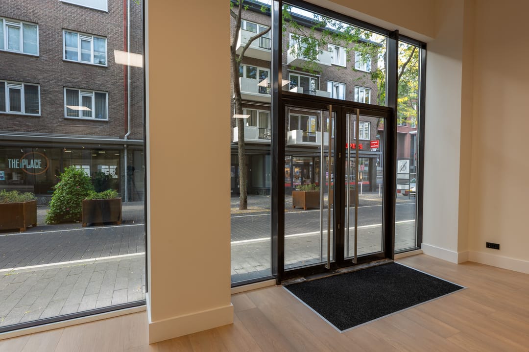 Door het samenvoegen van twee panden is een royale, lichte ruimte ontstaan met een dubbele glazen entree, brede frontbreedte en sterke visuele uitstraling.