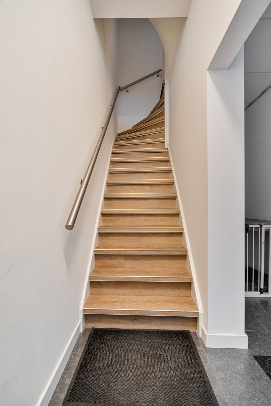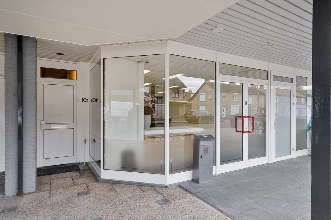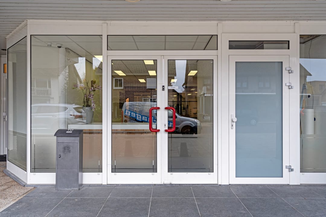 De overdekte entree op de begane grond geeft toegang tot zowel de commerciële ruimte als de woning.