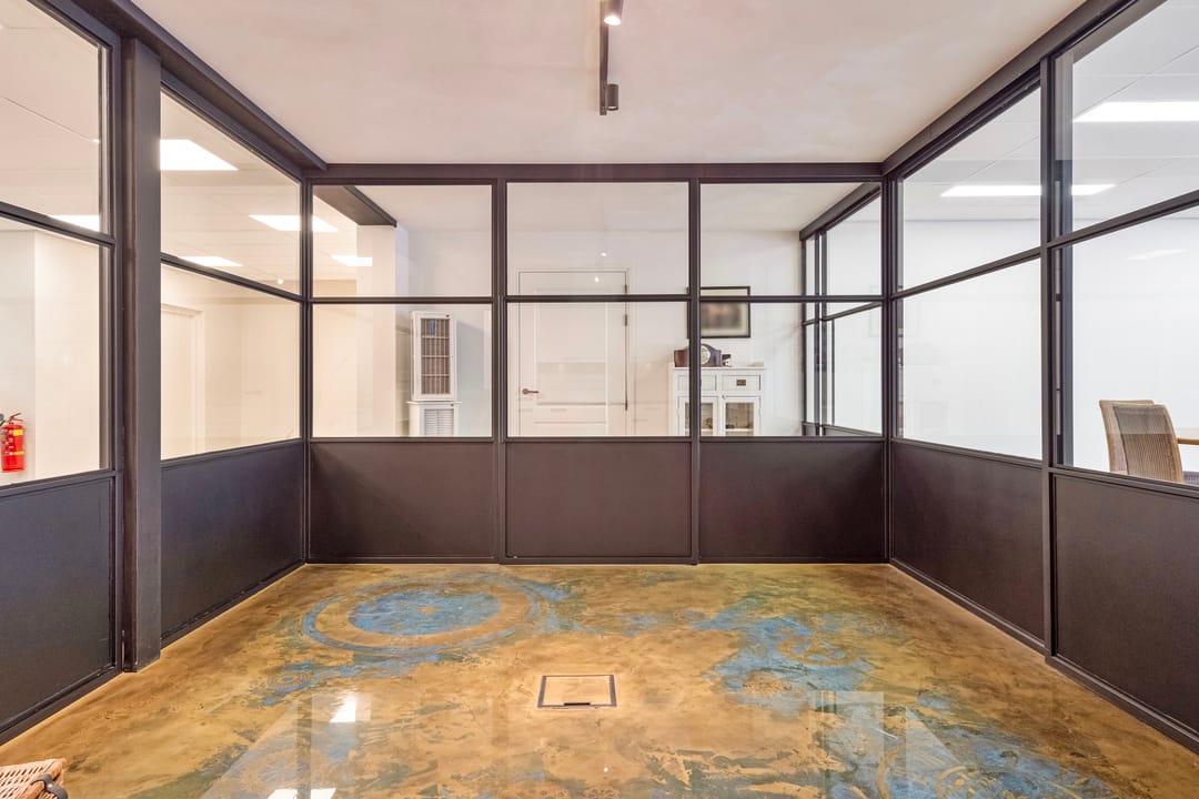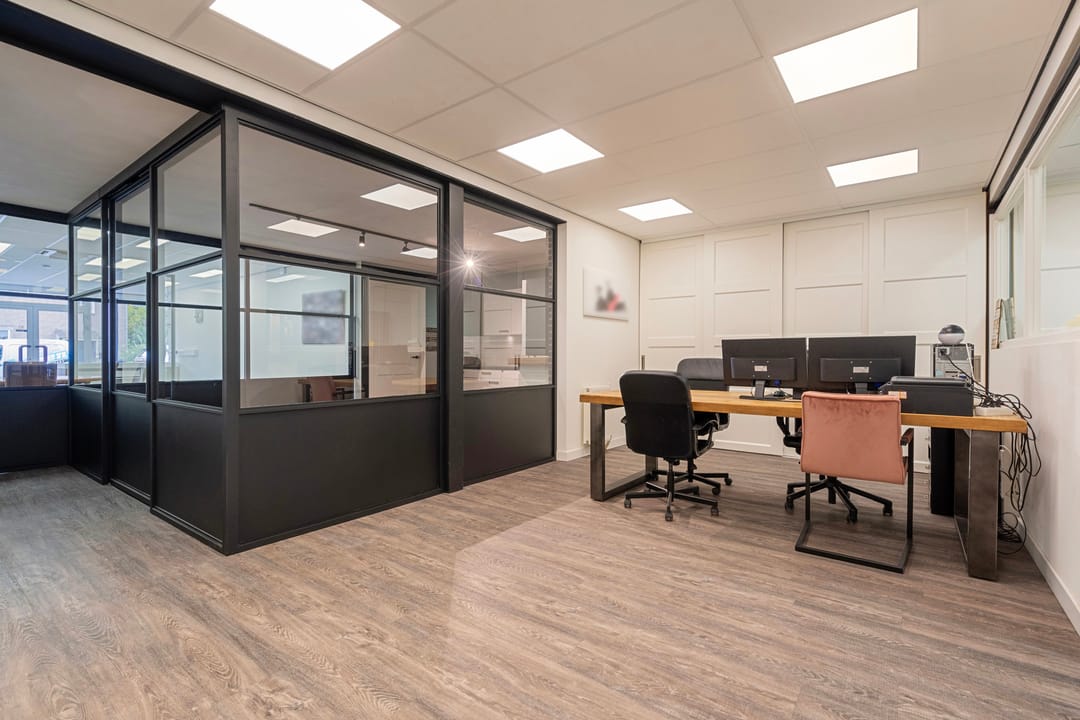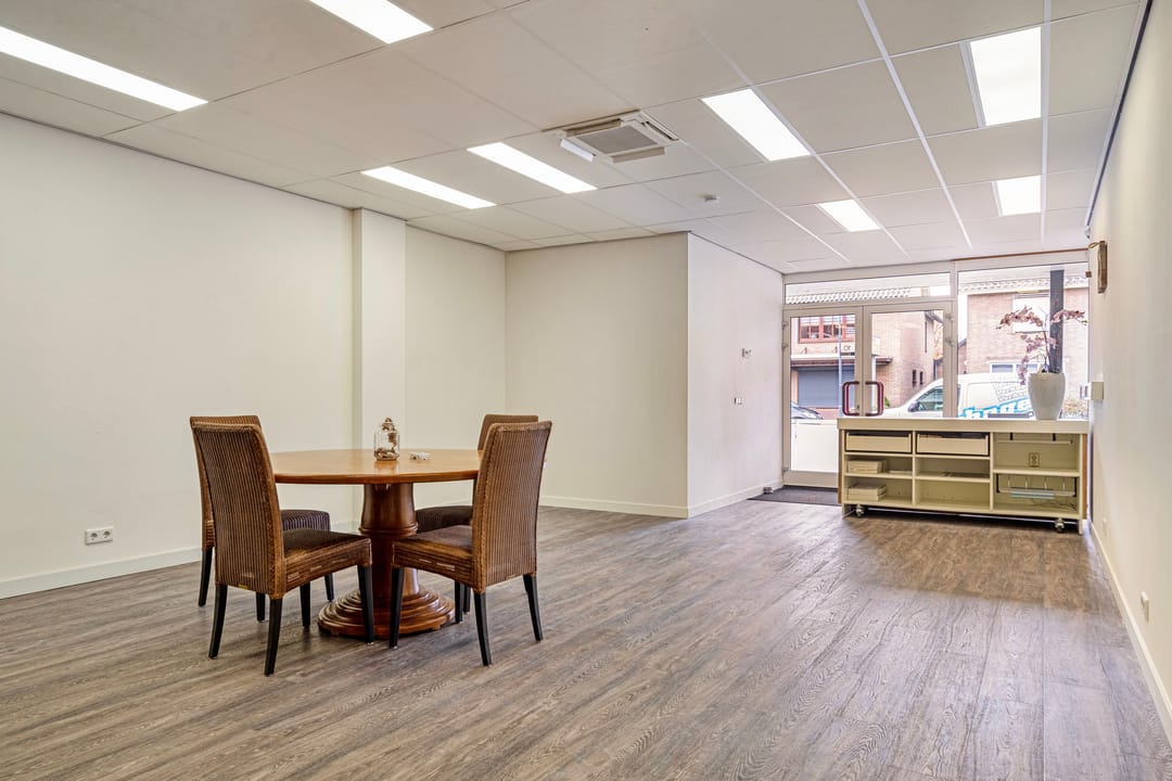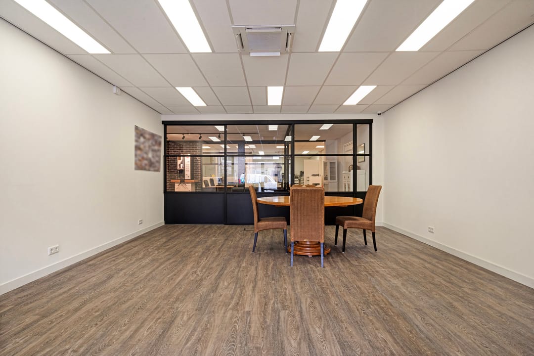 Een dubbele toegangsdeur biedt toegang tot de commerciële ruimte van in totaal ca. 180 m2. De diverse ruimtes zijn hoogwaardig afgewerkt met een pvc vloer met vloerverwarming, systeemplafond met ledverlichting en airco-units. Middels stalen schuifpuien is er toegang tot een centraal gelegen keuken en de achterin gelegen werkruimtes.