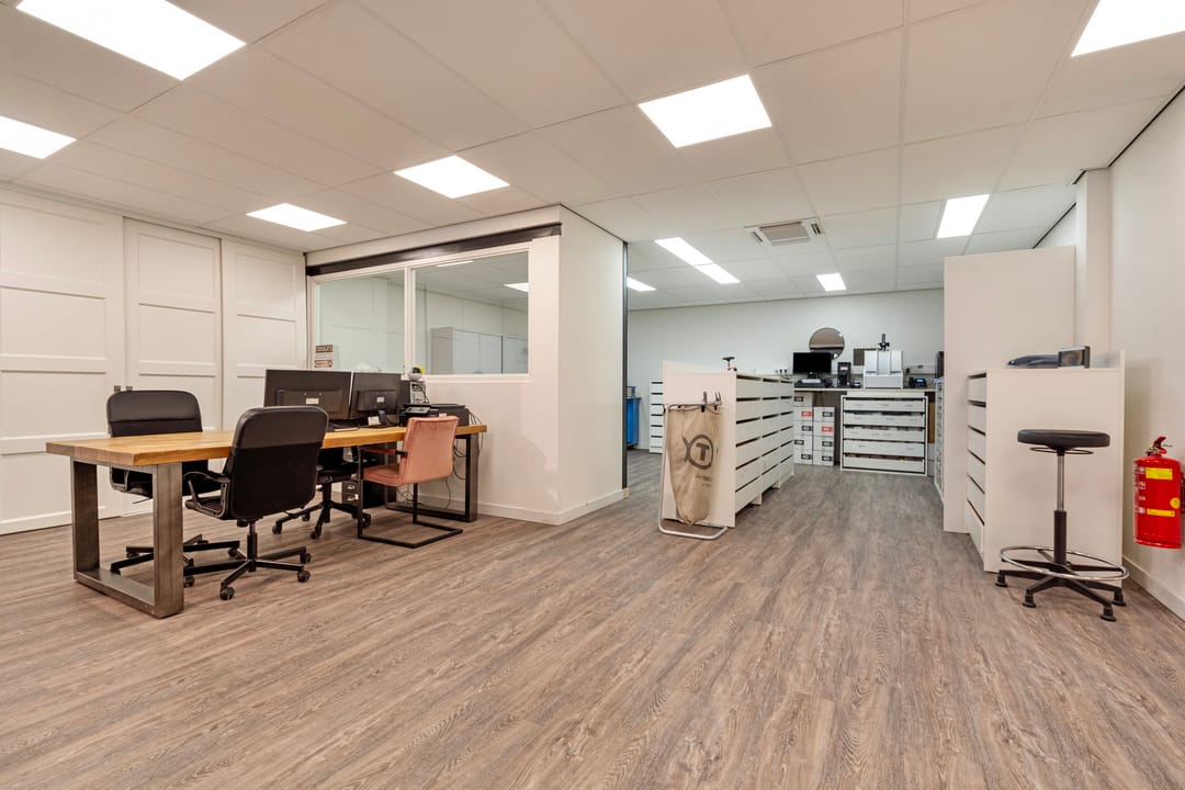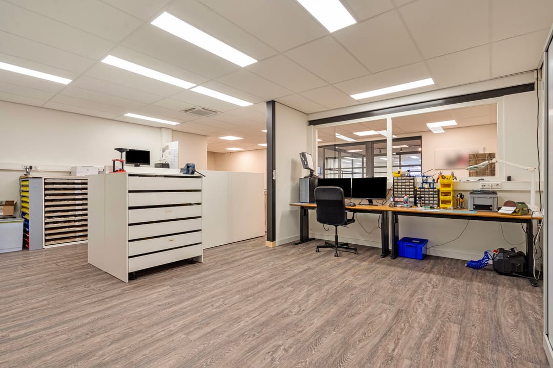 De werkruimtes annex winkelruimte aan de achterzijde is voorzien van een vaste kastenwand met schuifdeuren en er is een afsluitbare opslagruimte annex magazijn aanwezig. Deze ruimte is voorzien van een vloer put met o.a. internet en elektra en er is een vaste kastenwand in de ruimte aanwezig.