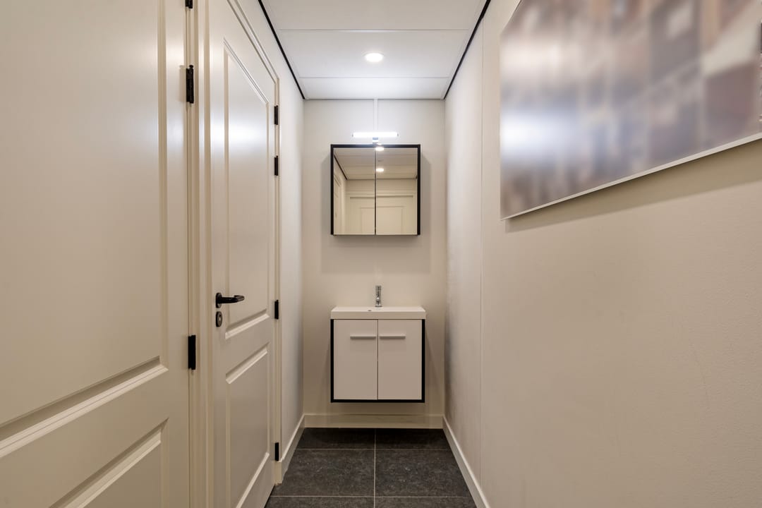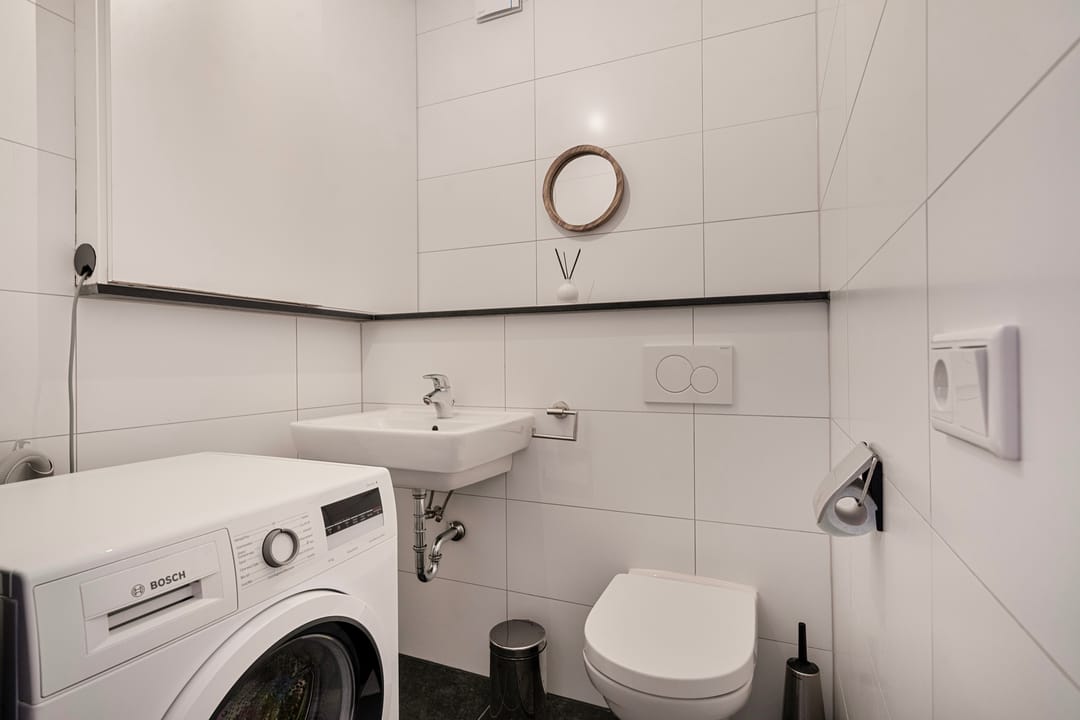 De toiletruimte annex bijkeuken voorziet in een hangend toilet, wastafel, wasmachine aansluiting en de opstelling voor de cv-installatie uit 2019.