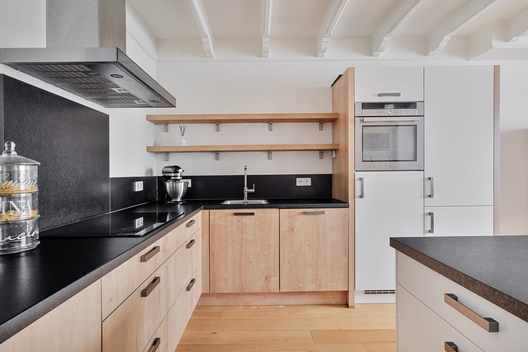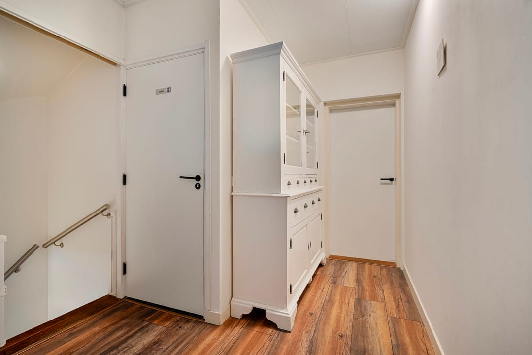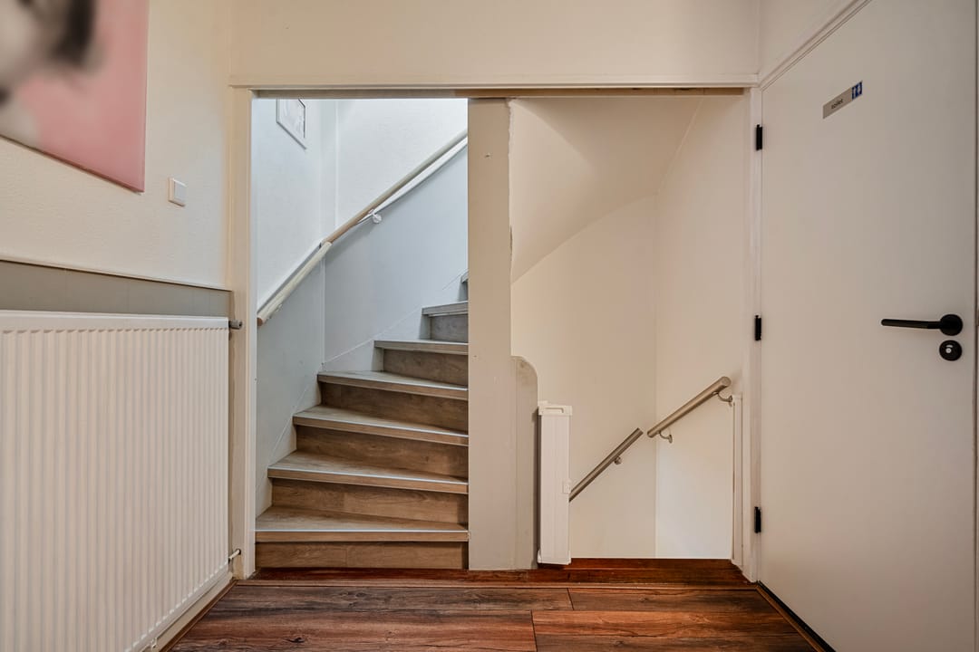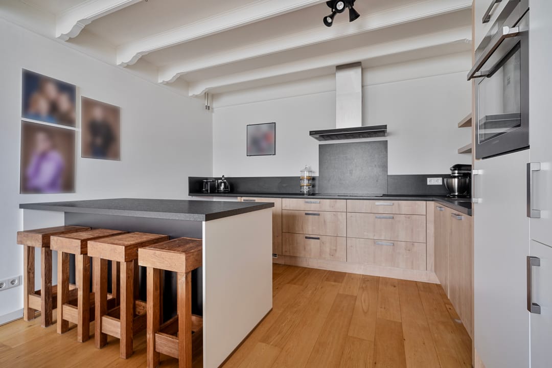 De keuken is voorzien van een unieke vloer en heeft een keukenblok in wandopstelling bestaande uit een koelkast, vrieslades, vaatwasser en spoelbak. Aangrenzend bevindt zich de technische ruimte met de (elektrische) cv-installatie uit 2023 en een trapkast met de moderne meterkast.