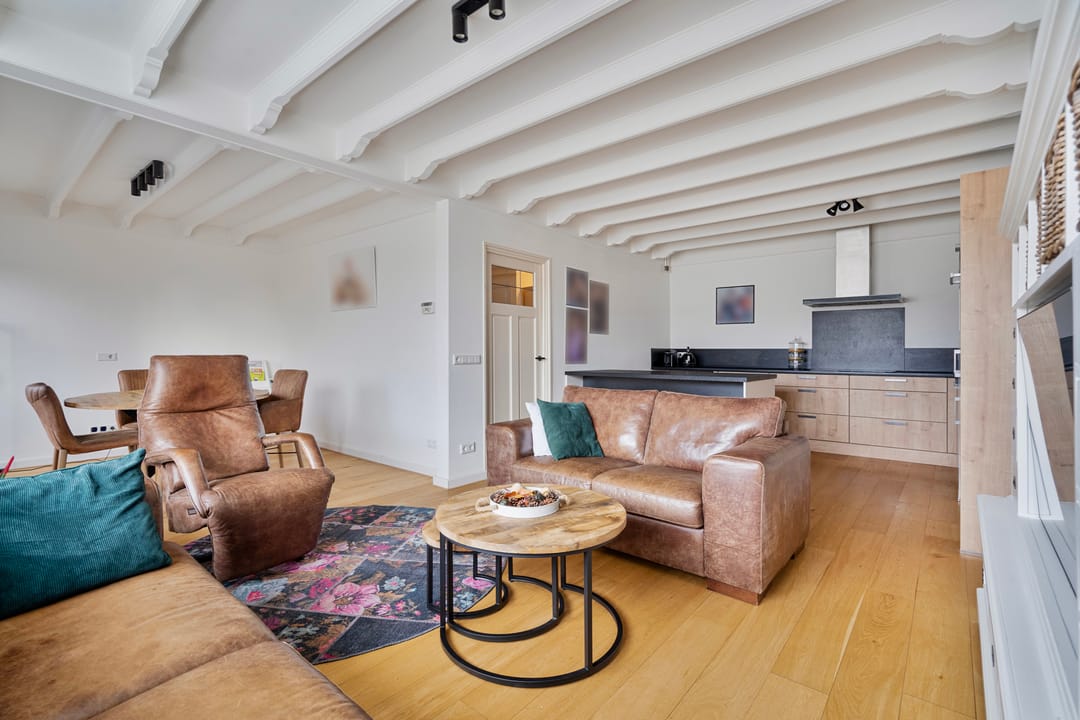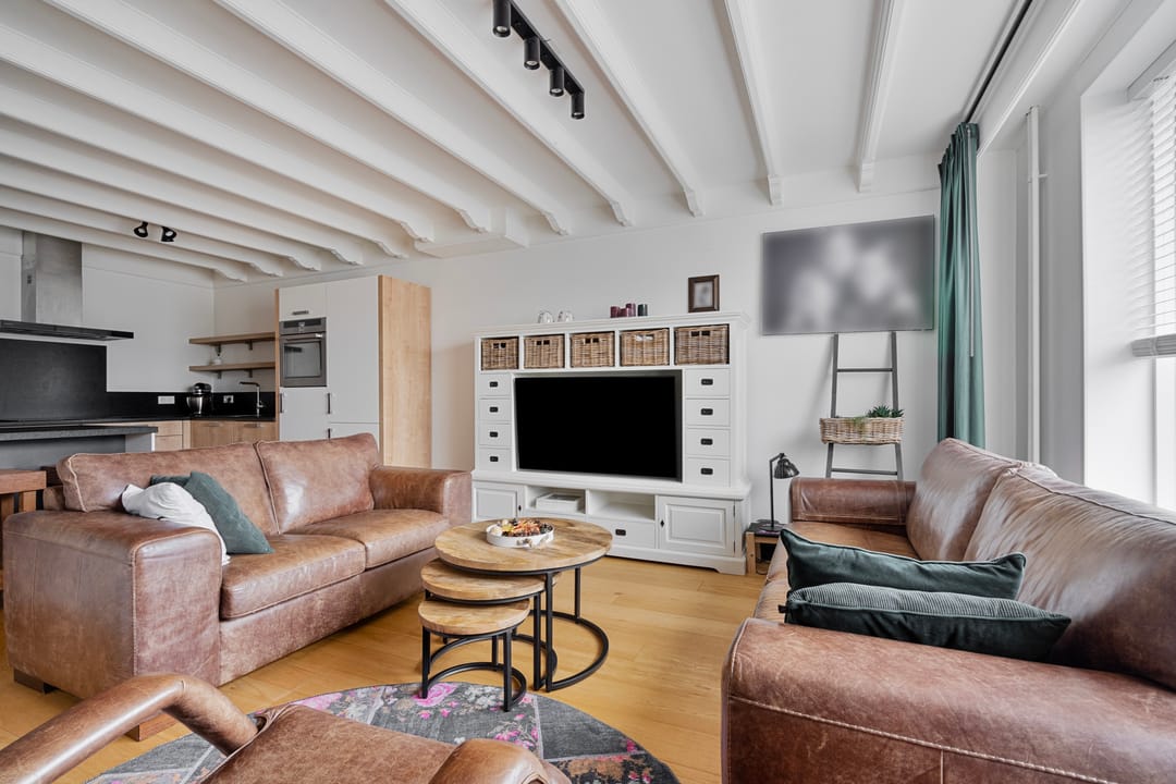 De woonkamer is aan de voorzijde van de woning gelegen en is in lichte tinten afgewerkt met gladde wanden, een sierbalken plafond en een parketvloer. Aan de voorzijde zorgt een groot venster met elektrisch bedienbaar rolluik voor lichtinval.