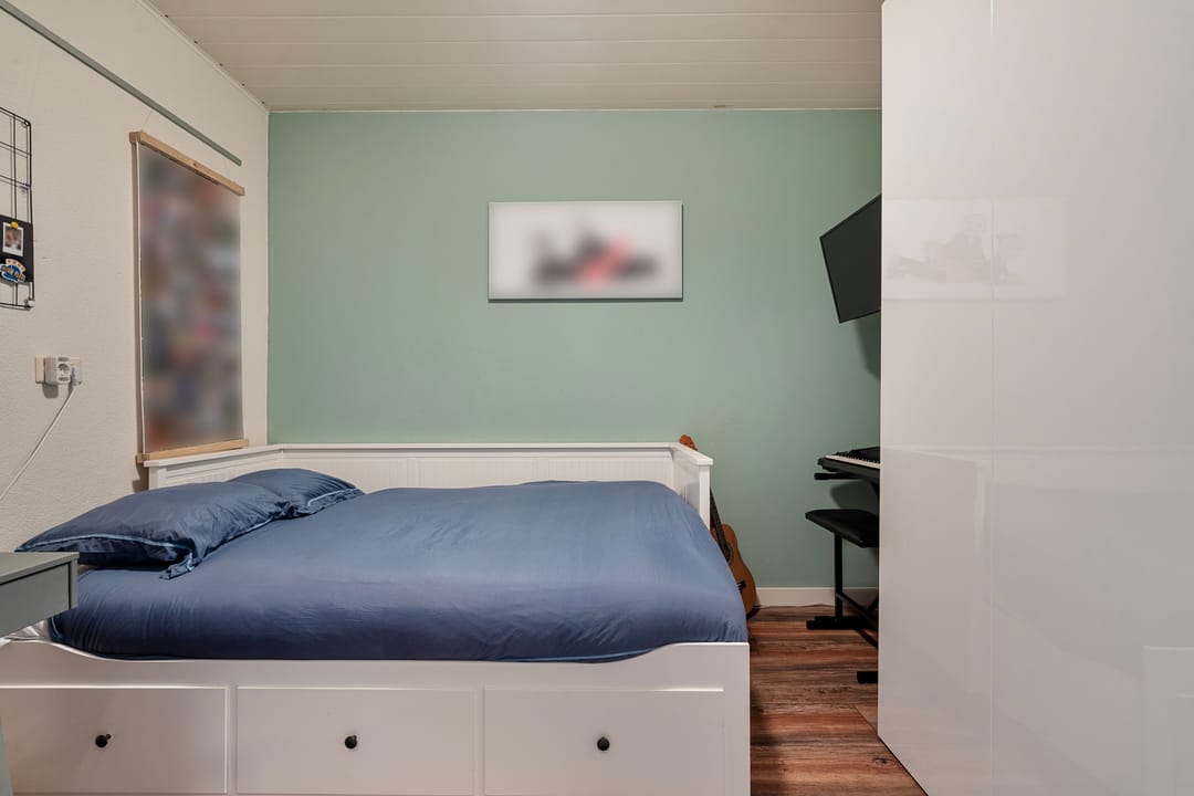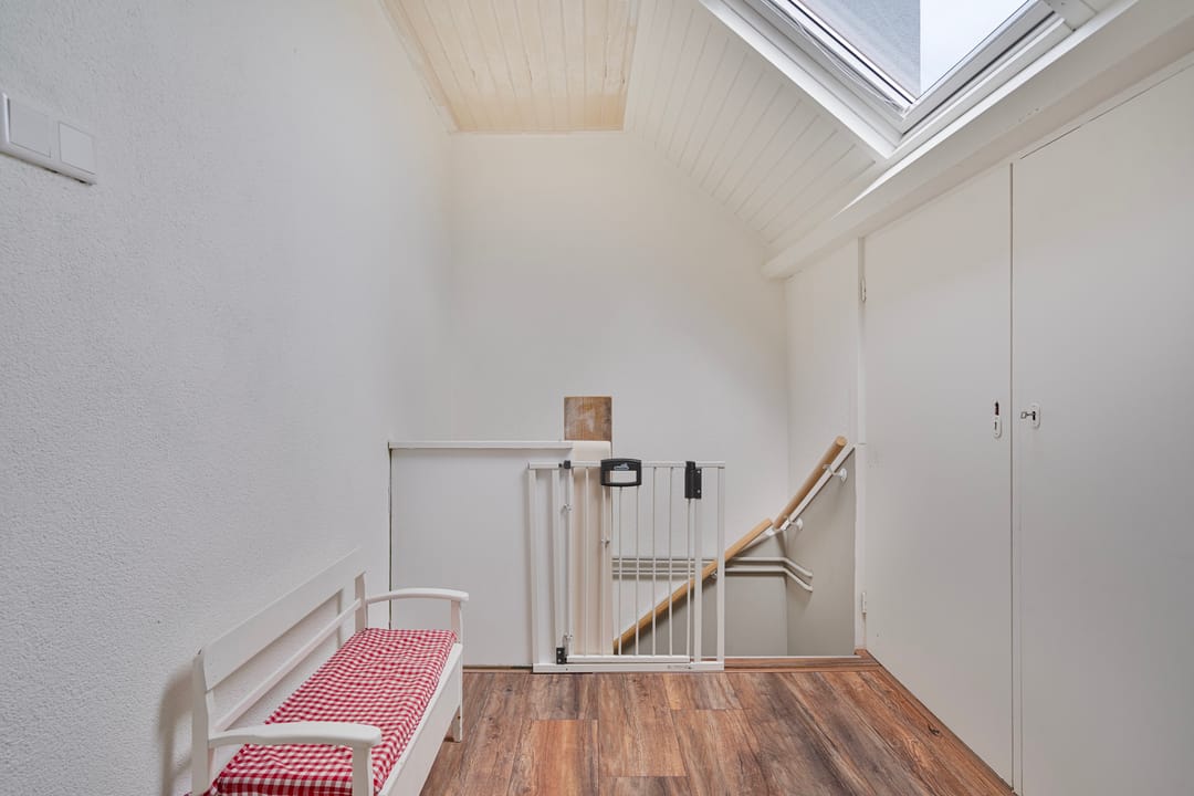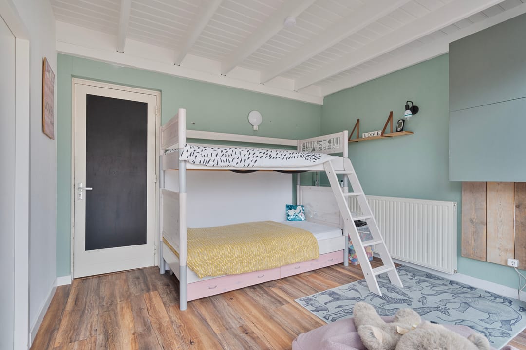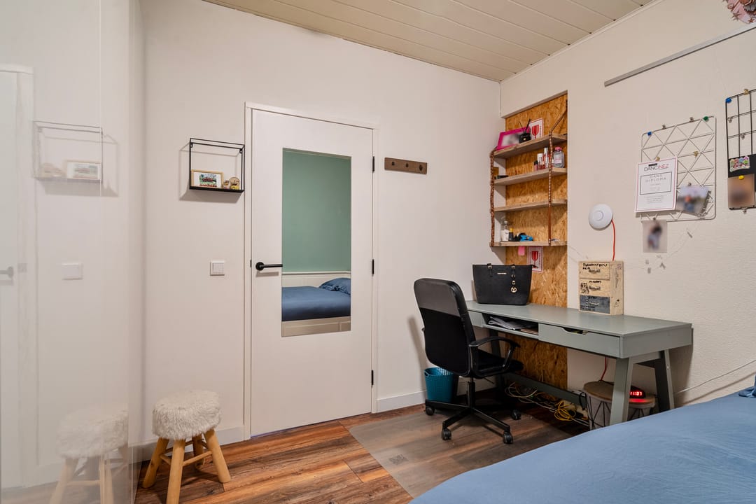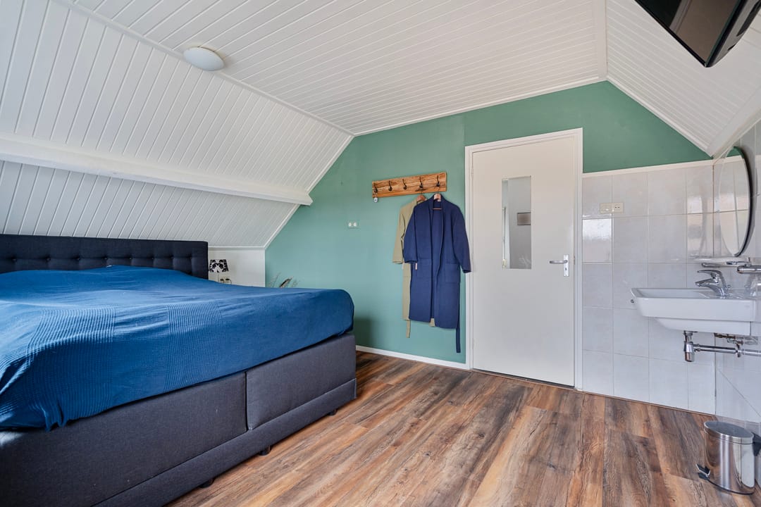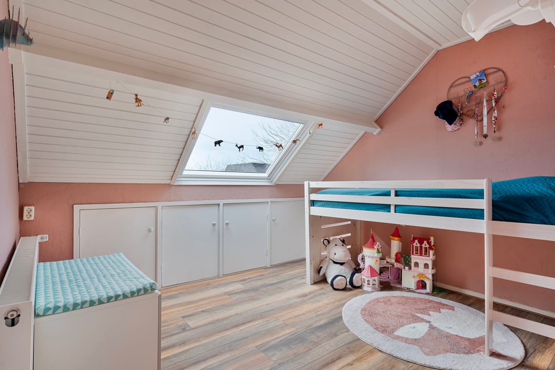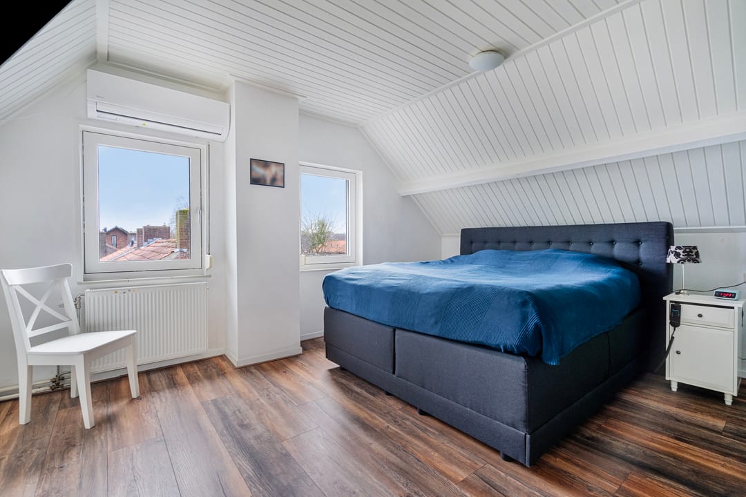 Een vaste trap geeft toegang tot een voorzolder op de 2e verdieping met aangrenzend nog eens 2 slaapkamers. Er is kastruimte aanwezig en een dakvenster zorgt voor lichtinval. De 4e slaapkamer is voorzien van een dakvenster en vaste kasten. De ruime 5e slaapkamer beschikt over een wastafel, inbouwkasten, airco-unit en vensters met rolluiken.