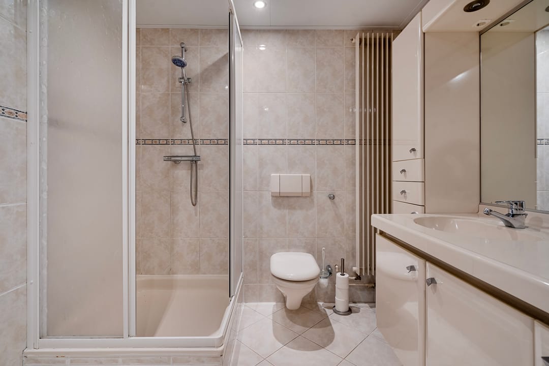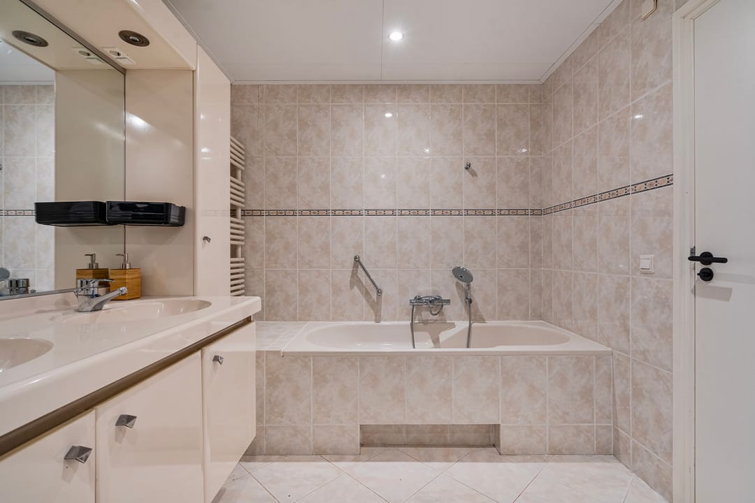 De ruime badkamer heeft een douchecabine, dubbele wastafel in een badmeubel, ligbad, hangend toilet en twee designradiatoren.
