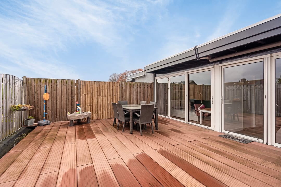 Het dakterras van ca. 44 m2 is geheel omheind en belegd met kunststof vlonders.