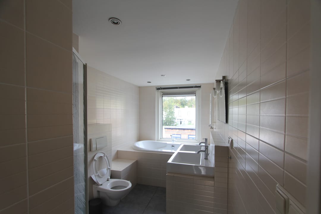 Tweede etage: ruime overloop, twee slaapkamers en een luxe badkamer met ligbad, douche, dubbele wastafel en toilet (ca. 45 m²).