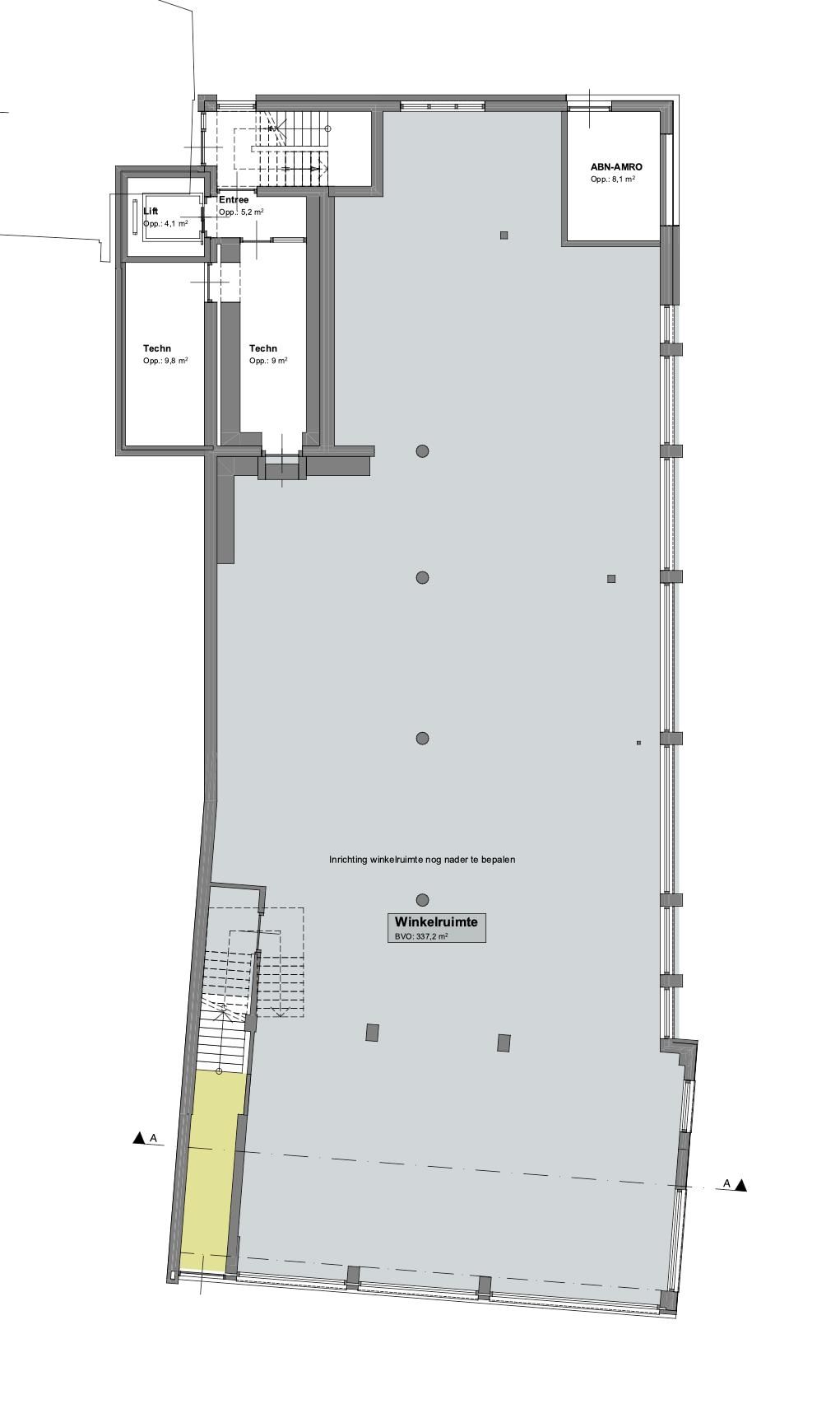 Indeling: winkelruimte van circa 340 m² casco met vloerverwarming. Frontbreedte circa 12 meter aan de Rijksstraatweg en circa 35 meter zijgevel langs het voetpad naar de Brinkhorst.