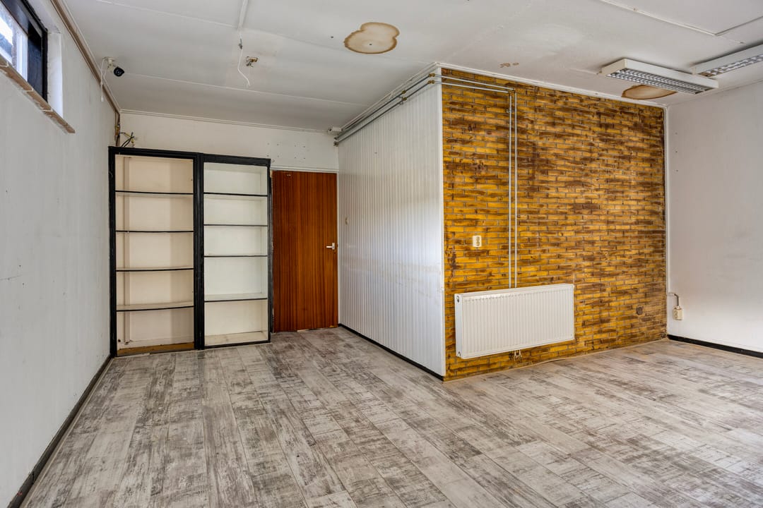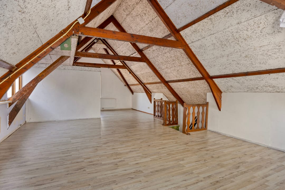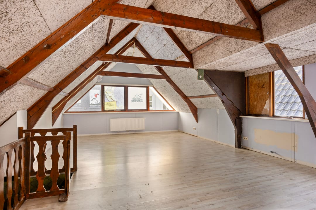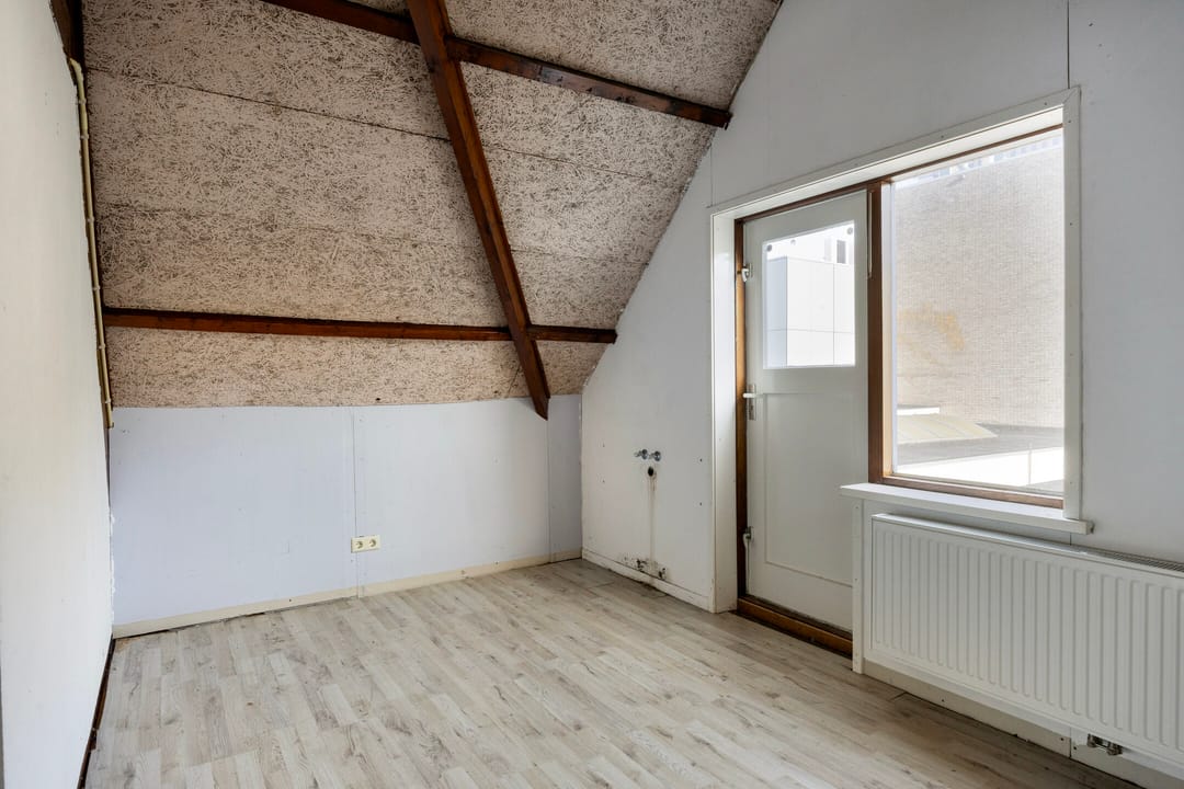 Entree, winkelruimte, meterkast, toilet, opslag met c.v.-ketel via vaste trap te bereiken verdieping die thans als één grote ruimte is ingedeeld met deur naar plat dak.