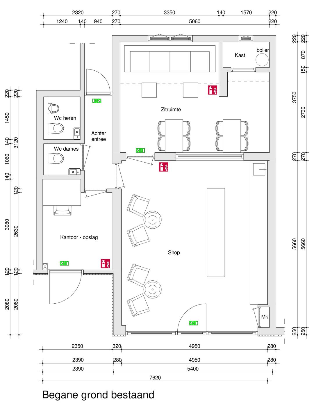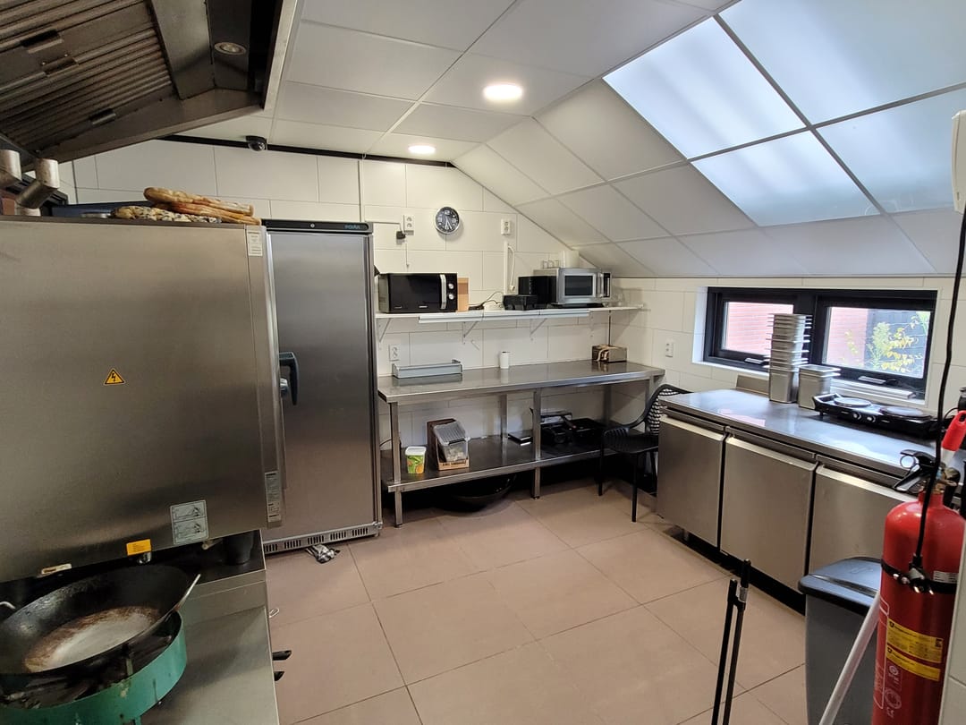 Horeca-/publieksruimte, keuken, gang met dames- en herentoilet, magazijn (ook van buitenaf bereikbaar). Middels een vlizotrap is de bergruimte op de verdieping bereikbaar.