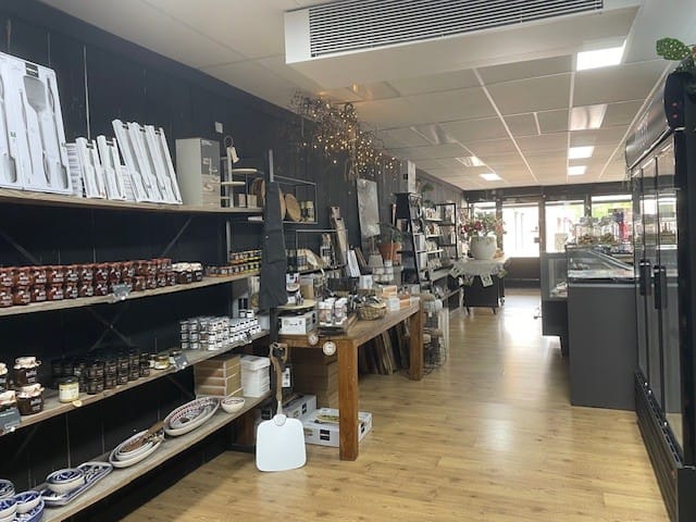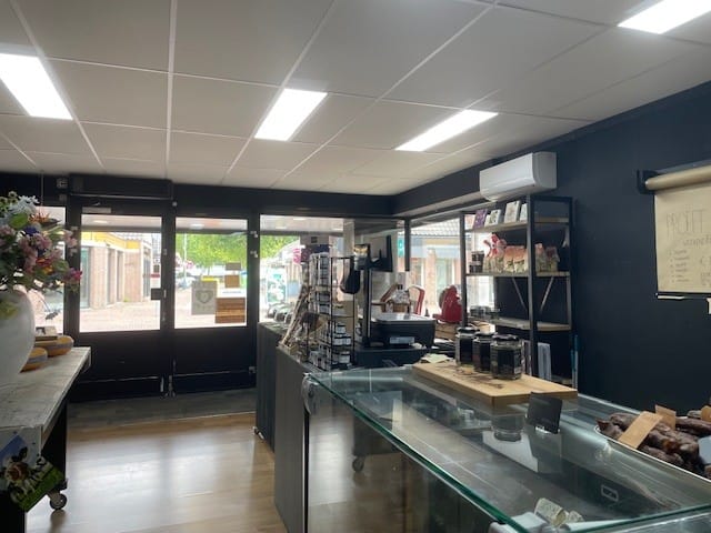 Entree met balie, winkelruimte,(oppervlakte ca 164 m² inclusief berging) opslagruimte (ca 45 m²) met overheaddeur, koelcel, keuken met keukenblok en toilet.