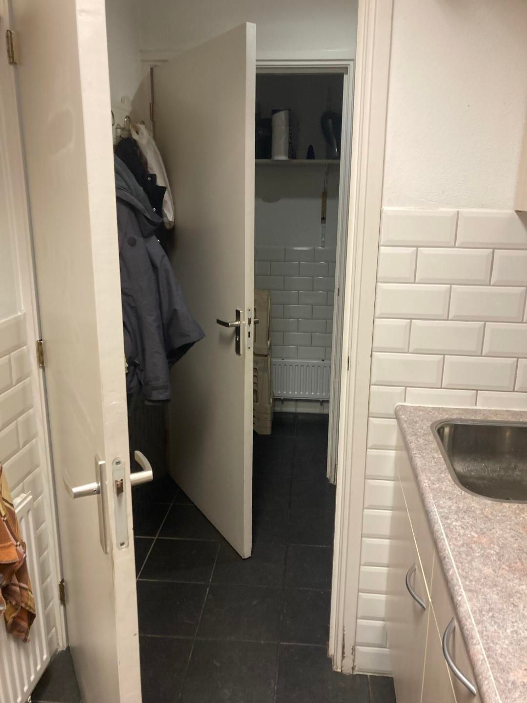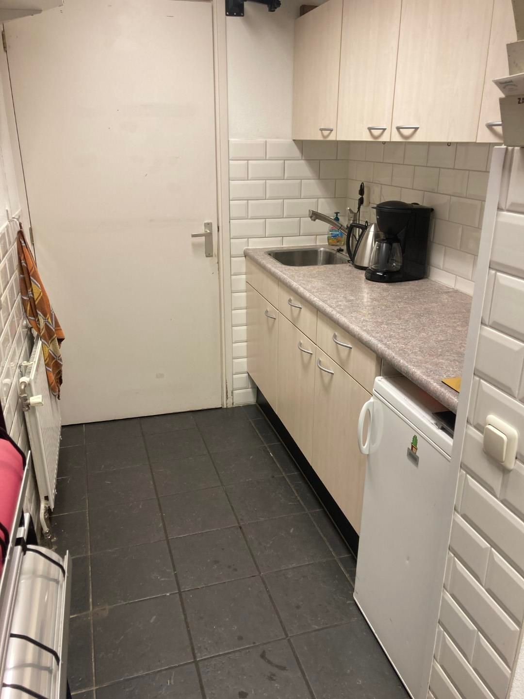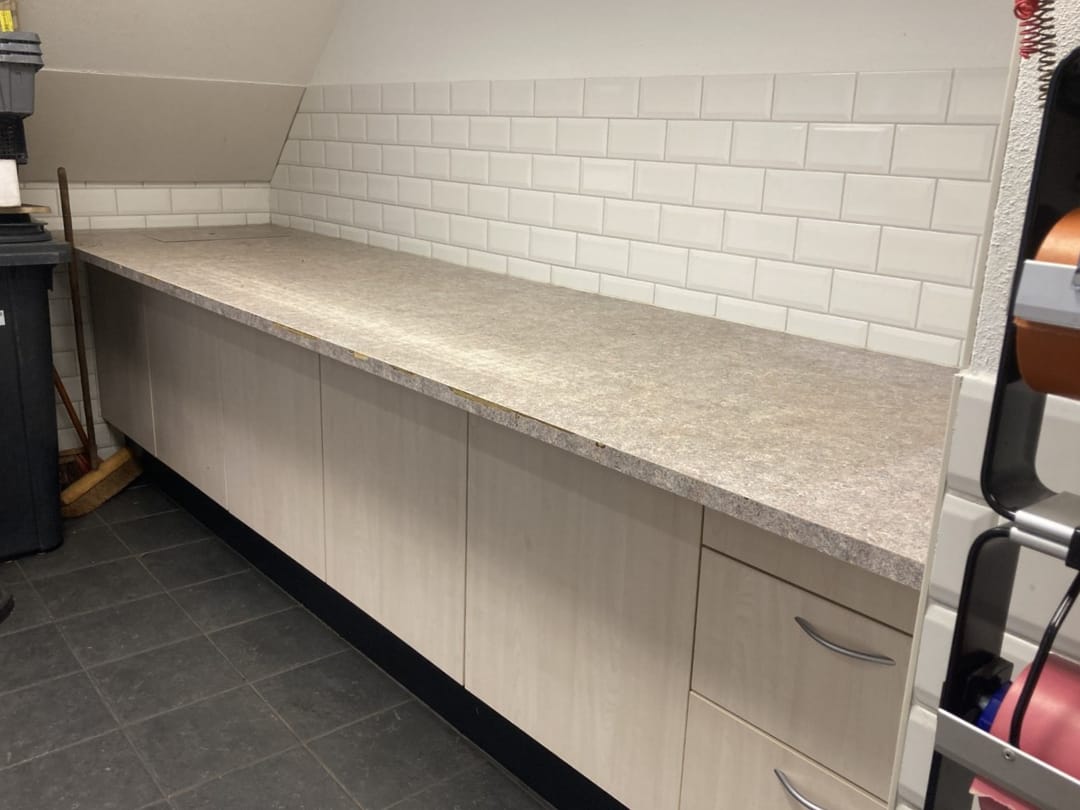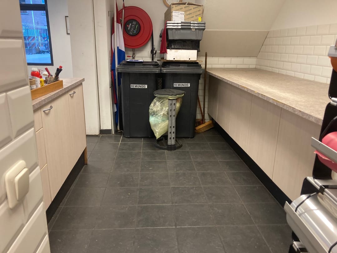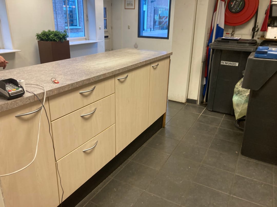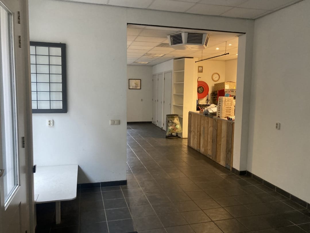 In deze ruimte vind je toegang tot de stookruimte, de meterkast en een bergkast—allemaal netjes weggewerkt zodat je winkel strak oogt zonder rondslingerende rommel. Verderop staat een balie met daarachter een werktafel, ideaal voor backoffice-klusjes, administratie of het voorbereiden van bestellingen—alles op een plek waar je overzicht behoudt. Vanuit hier leidt een doorgang naar een separate ruimte met een compacte pantry (handig voor koffie/theepauzes), een garderobe met wastafel en toegang tot het toilet. Alles voelt logisch, praktisch en toch verrassend sfeervol, alsof het pand meegroeit met je ideeën.