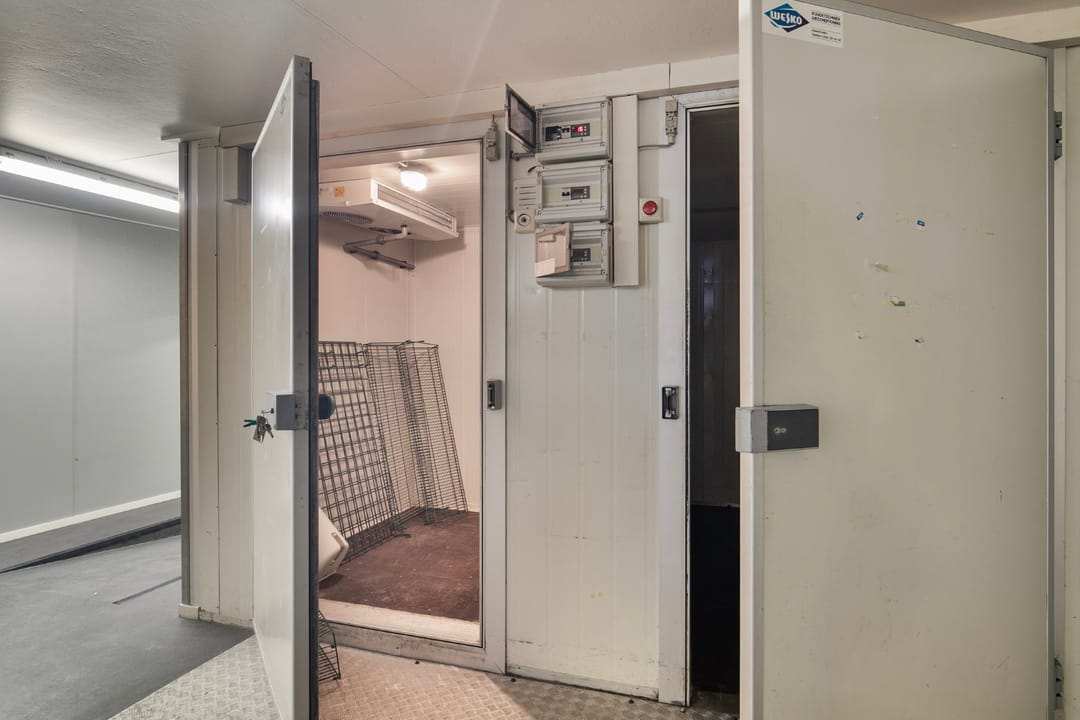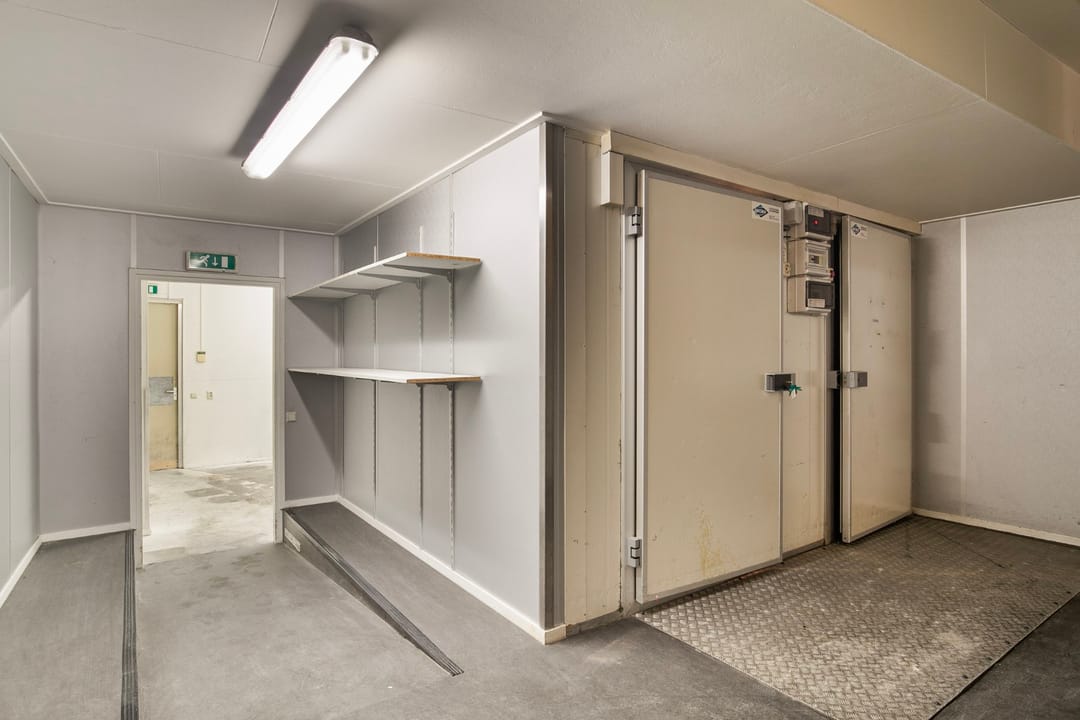 Loop je verder door, dan kom je in een doorgang naar een dubbele koelcel. Deze zijn perfect voor het bewaren van verse producten of voorraad die specifieke temperatuurbeheersing nodig heeft. Dit maakt het pand zeer geschikt voor ondernemingen die werken met etenswaren of producten die een lange houdbaarheid vereisen.