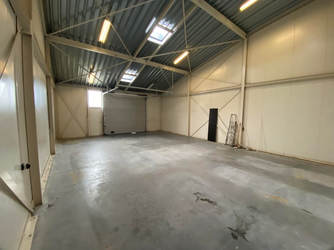 - circa 105 m² bedrijfsloods (schuin oplopend dak voor extra opbergmogelijkheden);