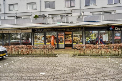 Een levendige omgeving met diverse soorten bedrijvigheid, waaronder een Jumbo, restaurant, apotheek, dierenkliniek, bakker, slager en snackbar. De locatie biedt daarnaast ruime parkeergelegenheid en wordt omringd door groene voorzieningen.