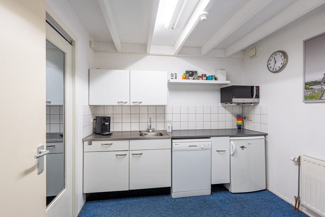 De vloer is afgewerkt met tapijt en de ruimte is fraai verlicht middels LED TL-armaturen en een verlaagd plafond met inbouwspots. De wanden zijn opgebouwd uit houtskeletbouw, wat flexibiliteit biedt in de indeling. Dankzij slim gebruik van de hoogte – de plafondhoogte bedraagt ca. 3,6 meter -, is er doormiddel van schotten, een geruime hoeveelheid extra bergruimte gerealiseerd. Aan de achterzijde bevinden zich een opslagruimte, een kantoor, pantry en toilet, alsmede een tweede uitgang met elektrisch rolluik, ideaal voor het ontvangen van leveringen. De pantry is voorzien van voldoende bergruimte, een vaatwasser, koelkast en spoelbak.