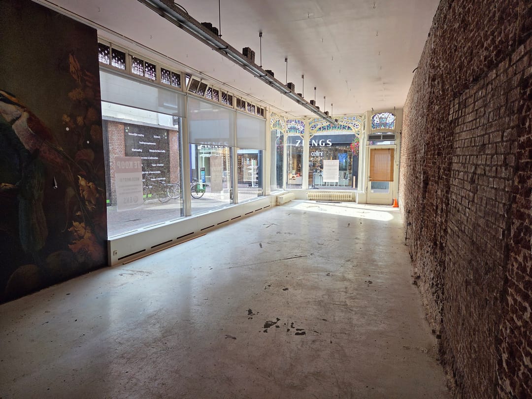 Hoofdstraat 73 te Meppel, winkelruimte met ruime frontbreedte en etalage. Voorzien van recent gerestaureerde kelderruimte, pantry, toilet, warmtegordijn en afgewerkte betonvloer.
