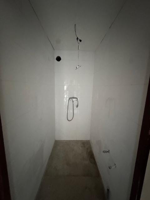 Hier een toilet (nog niet aangesloten) en eenvoudige douchecel. Aan de achterzijde een slaapkamer (4,25 x 2,60 meter). De woonkamer ligt aan de voorzijde (4,25 x 4,86 meter), beiden beschikken over een inbouwkast.