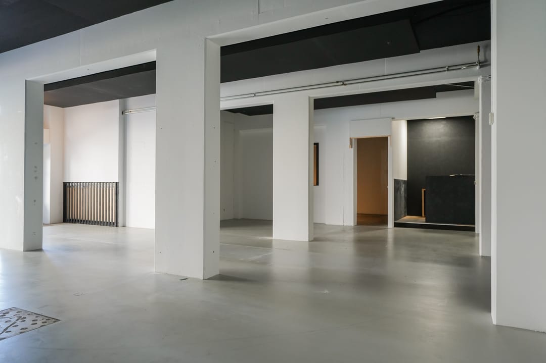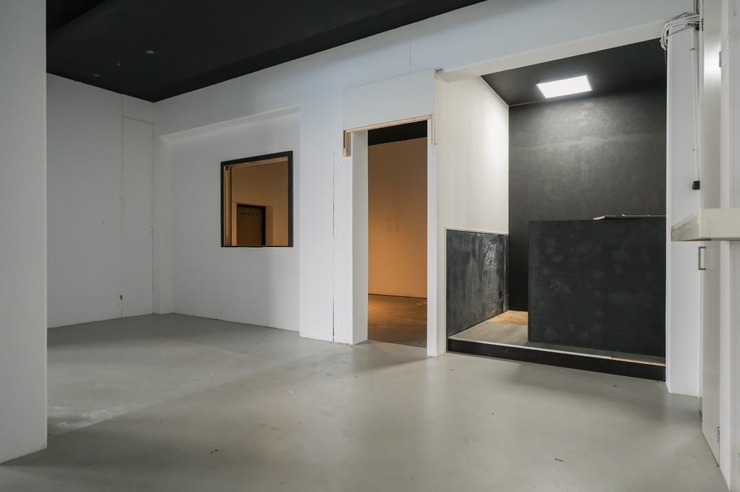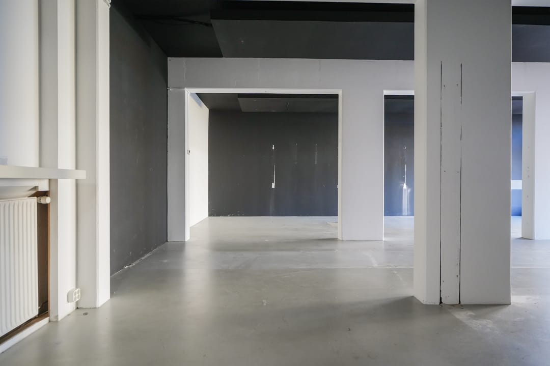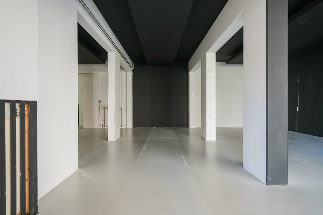 De afwerking is modern en neutraal, met een strakke gietvloer en licht afgewerkte wanden, waardoor de ruimte een frisse en professionele uitstraling heeft. De donkere accenten in het plafond en achterliggende ruimtes geven het geheel extra karakter. Daarnaast zorgt de indeling met doorgangen en separate ruimtes voor flexibiliteit in gebruik.