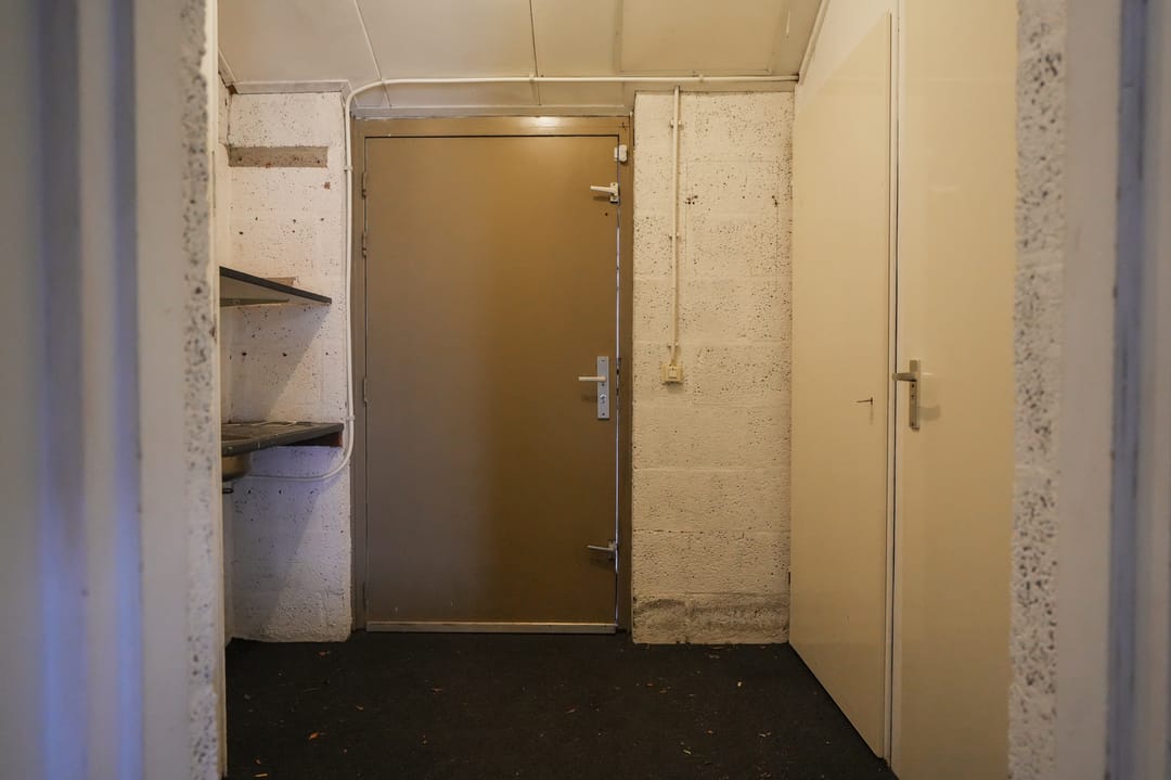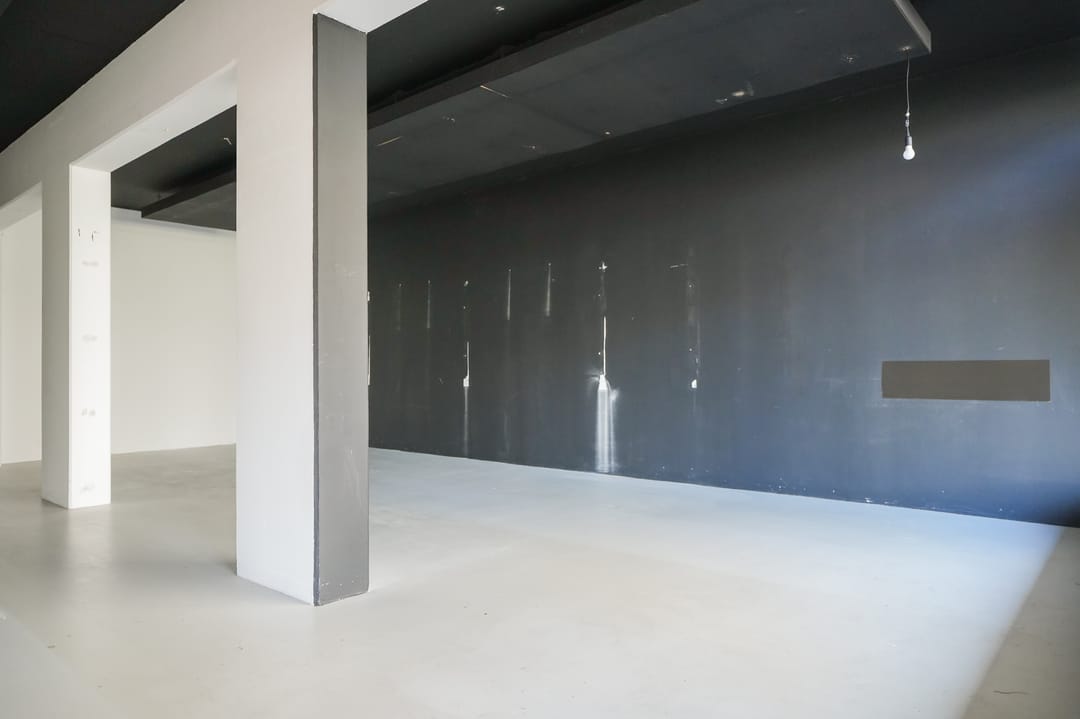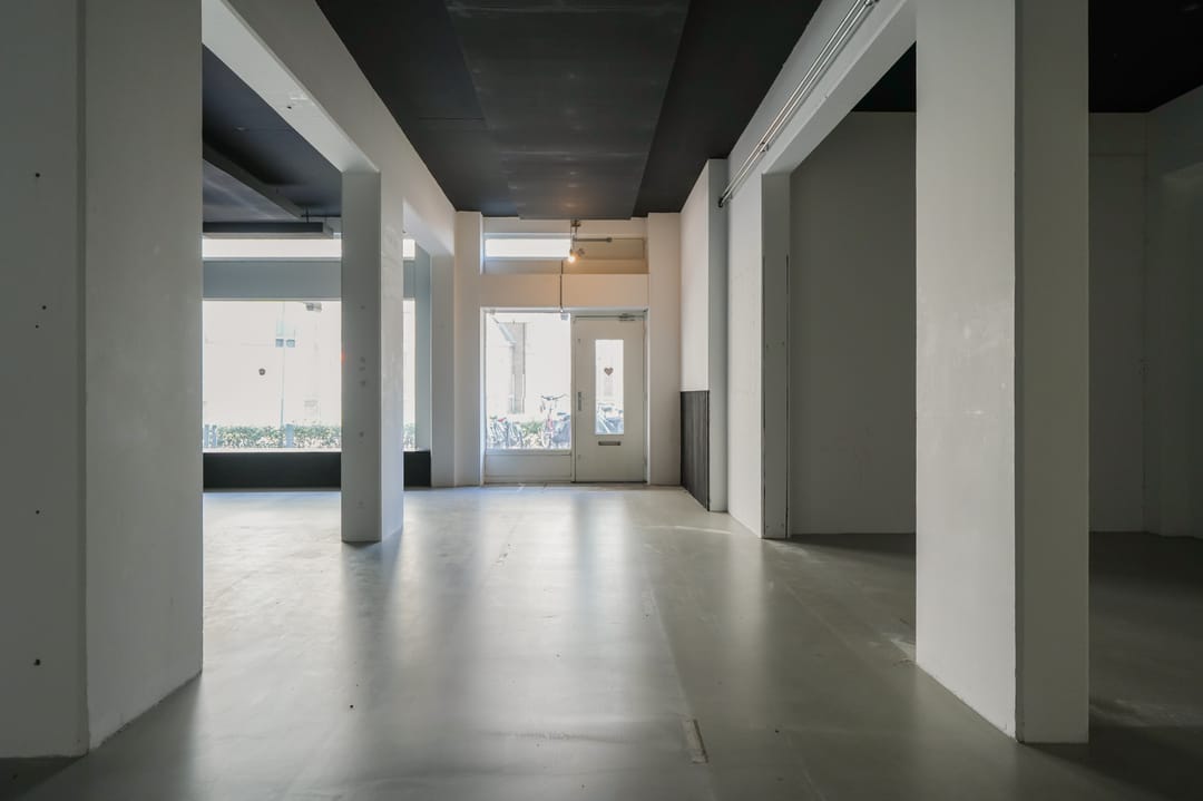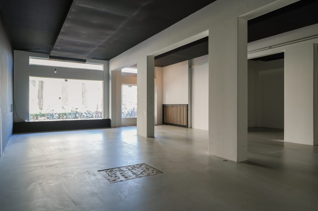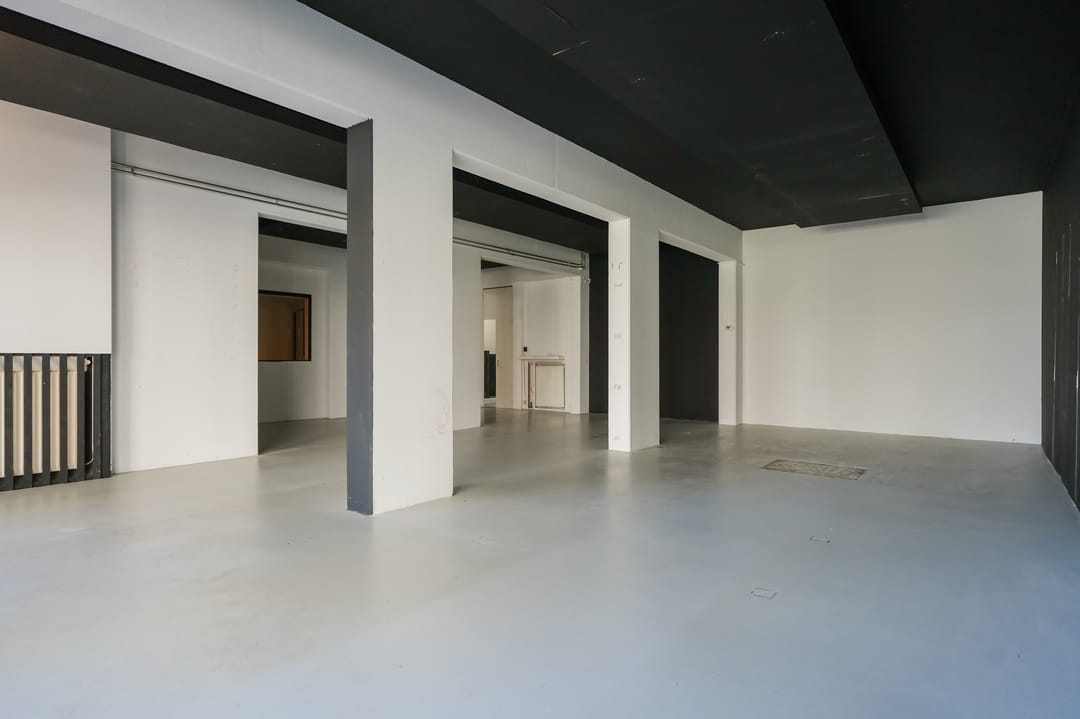 De afwerking is modern en neutraal, met een strakke gietvloer en licht afgewerkte wanden, waardoor de ruimte een frisse en professionele uitstraling heeft. De donkere accenten in het plafond en achterliggende ruimtes geven het geheel extra karakter. Daarnaast zorgt de indeling met doorgangen en separate ruimtes voor flexibiliteit in gebruik.