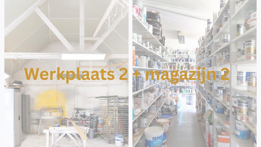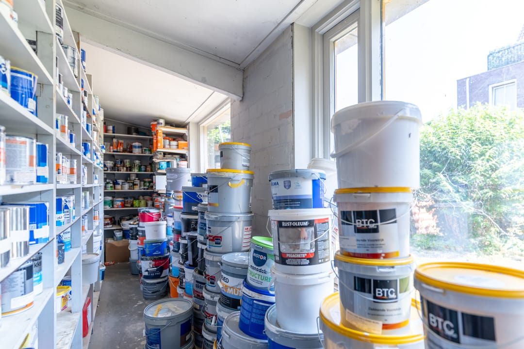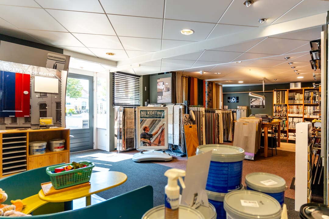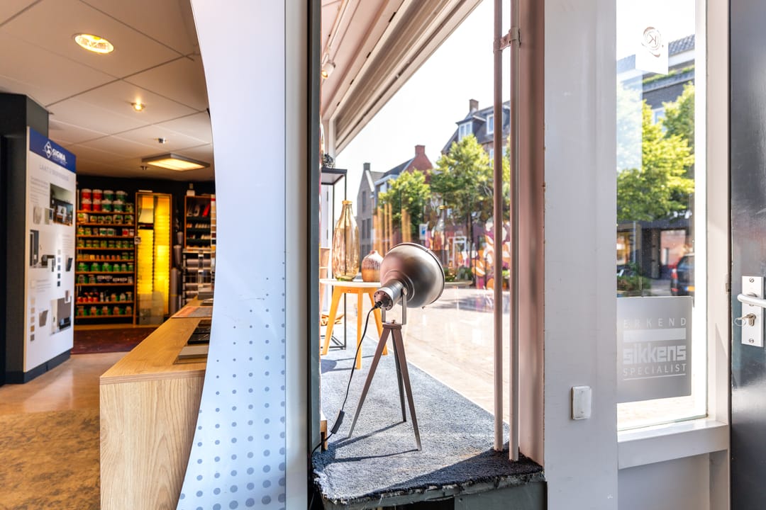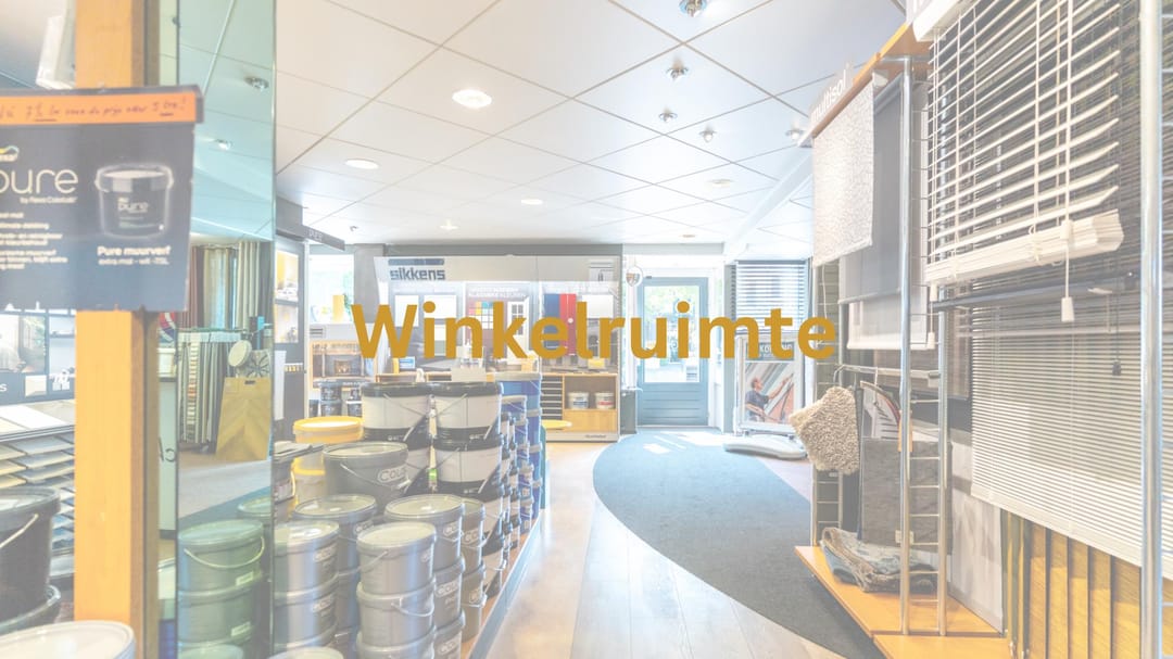 Aan de voorzijde van het pand bevindt zich de winkelruimte van de verfspeciaalzaak met 129 m² vloeroppervlakte. Een winkel met uitstraling en een prachtige etalage. De winkel geeft toegang tot een groot magazijn en de kantine met rechte keukenopstelling. Aan deze kantine grenst een hal met toegang tot een toilet en vervolgens tot een kantoorruimte voorzien van ingebouwde kastruimte en airco. Achter de kantoorruimte bevindt zich een tweede magazijn en beide grenzen aan een patiotuin. In de patiotuin bevinden zich nog twee bergingen.