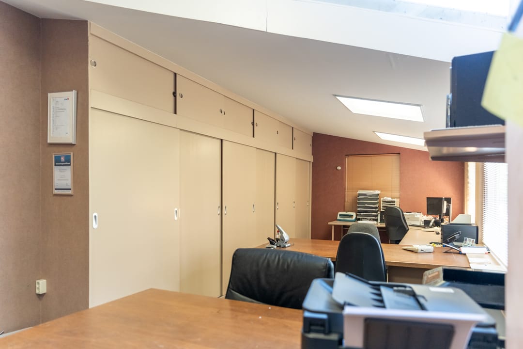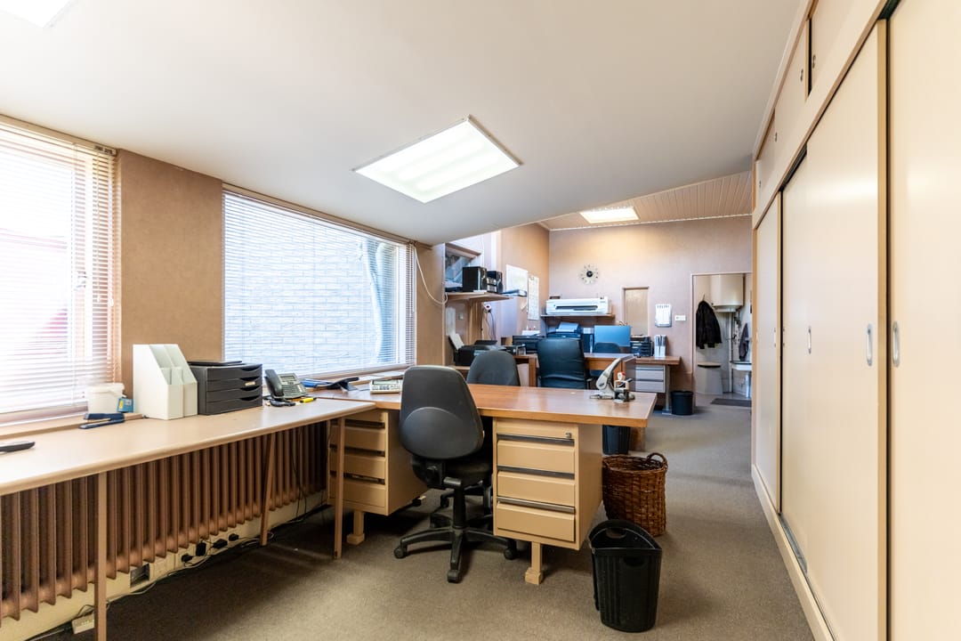 * Op de begane grond tref je de winkelruimte met kantine, magazijnen en een kantoorruimte van ca. 238 m².