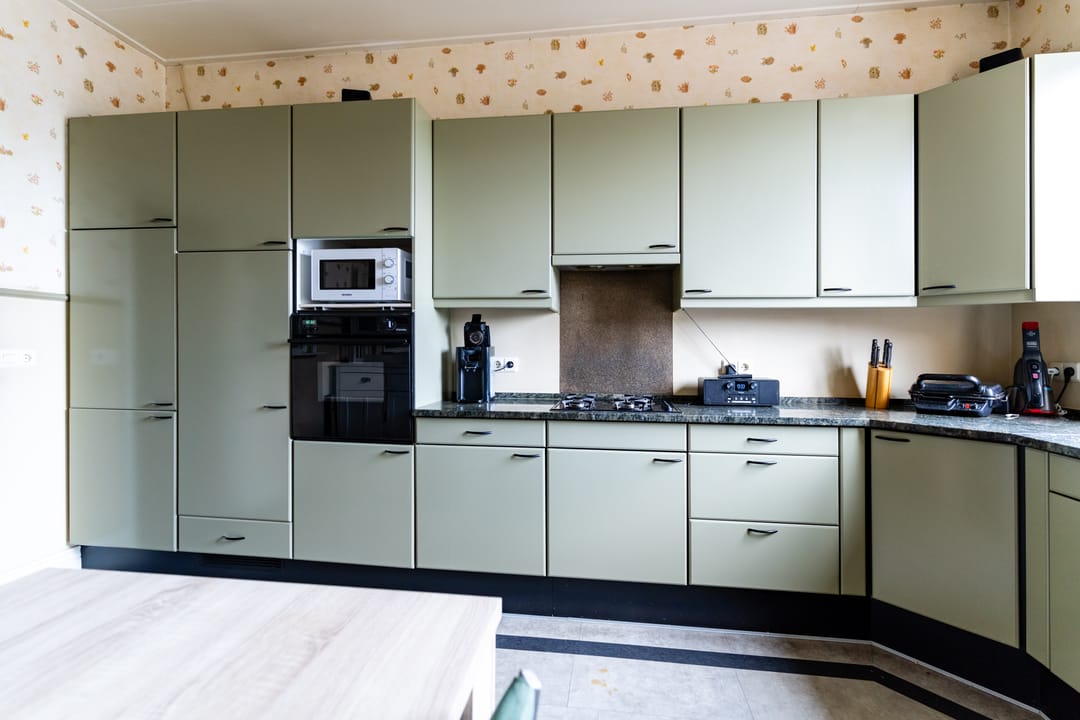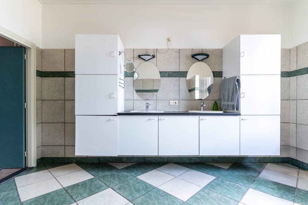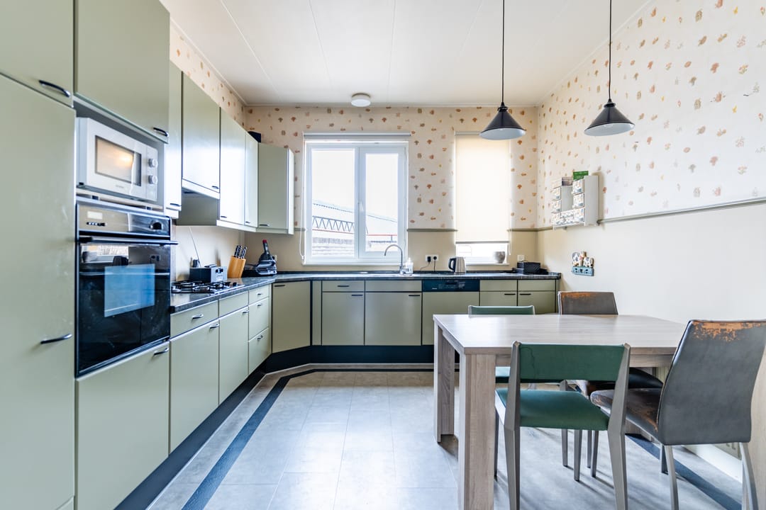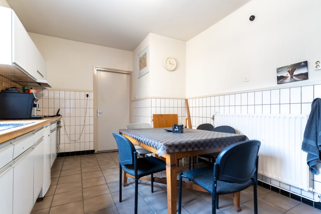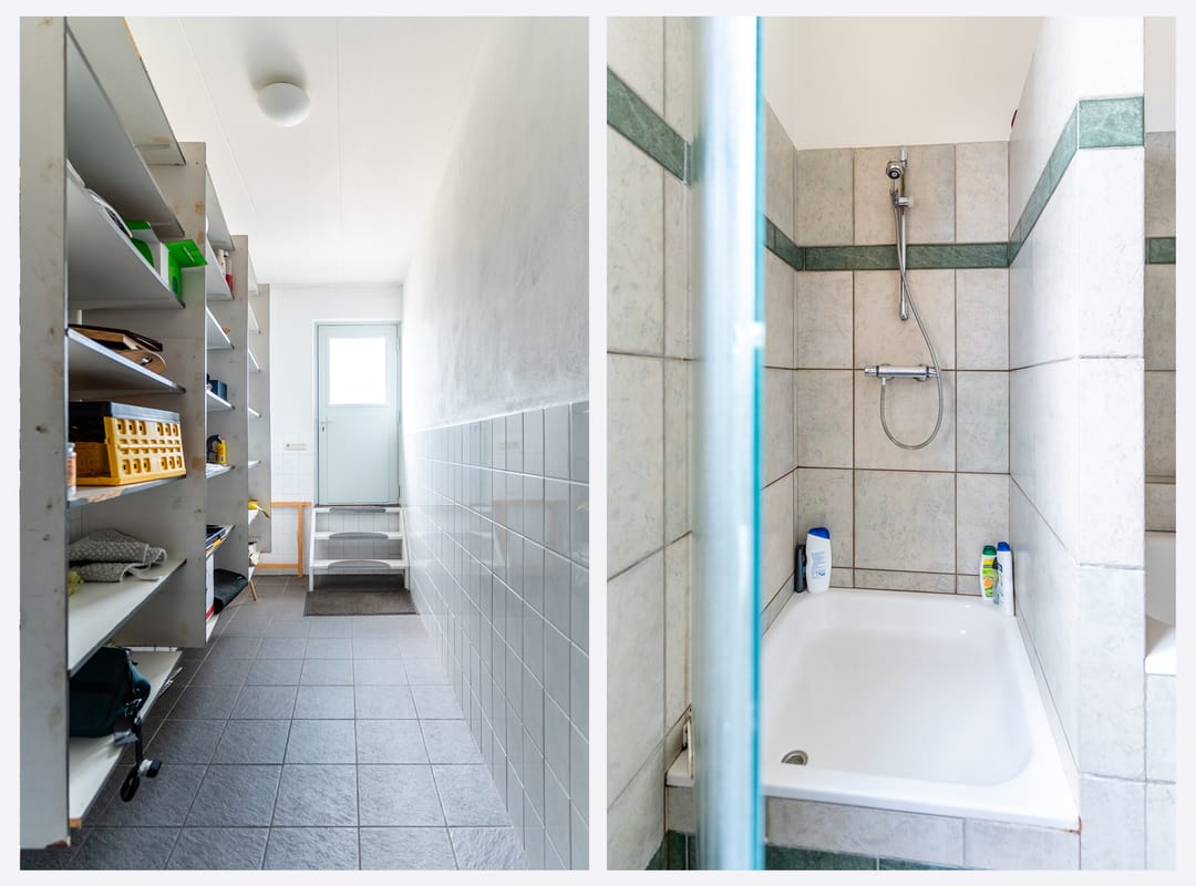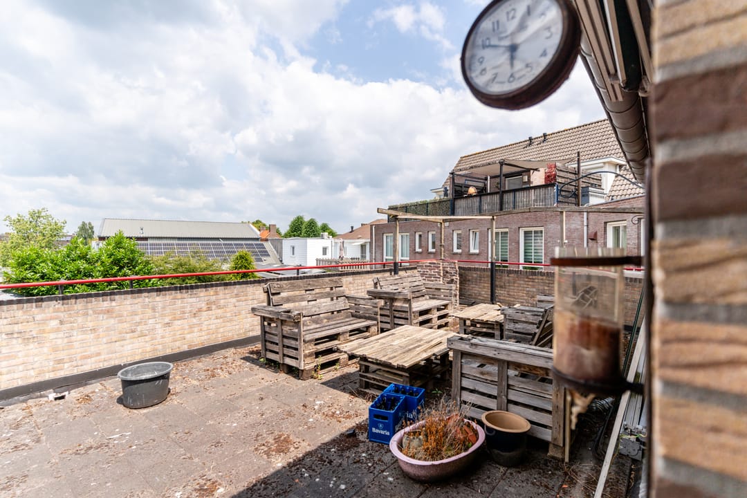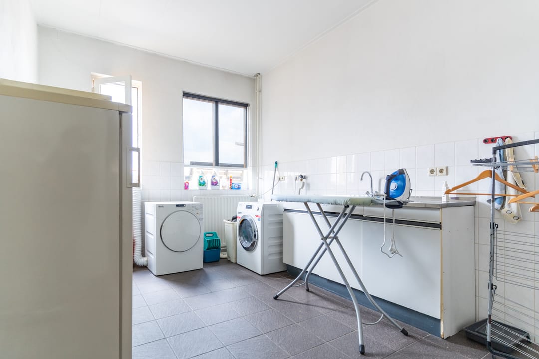 Aan de achterzijde tref je de separate keuken met zicht op het dakterras. De keuken heeft een hoekopstelling en is uitgerust met een rvs spoelbak, gaskookplaat met afzuigkap, koelkast, vaatwasser, oven en losse magnetron. Naast de keuken bevindt zich een doorgang naar het dakterras met volop bergruimte. Het dakterras ligt op het noordwesten en is een heerlijke en riante buitenruimte van 54 m². Aan de achterzijde van de eerste etage bevinden zich nog een grote bijkeuken/wasruimte en een badkamer. De wasruimte is gedeeltelijk betegeld en voorzien van een aanrecht. De geheel betegelde badkamer is uitgerust met een douche, toilet, ligbad en een groot wastafelmeubel met dubbele wastafel.