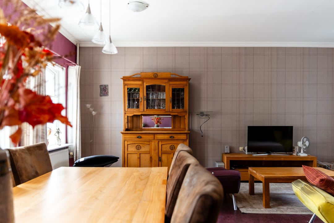 De woonkamer en drie slaapkamers bevinden zich aan de voorzijde van het pand en hebben daarmee uitzicht op de Dorpsbron. De L-vormige woonkamer is met ca. 33 m² lekker ruim en het glas-in-lood raam is een absolute eyecather.