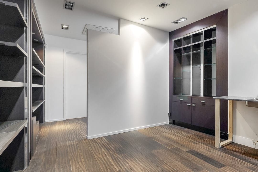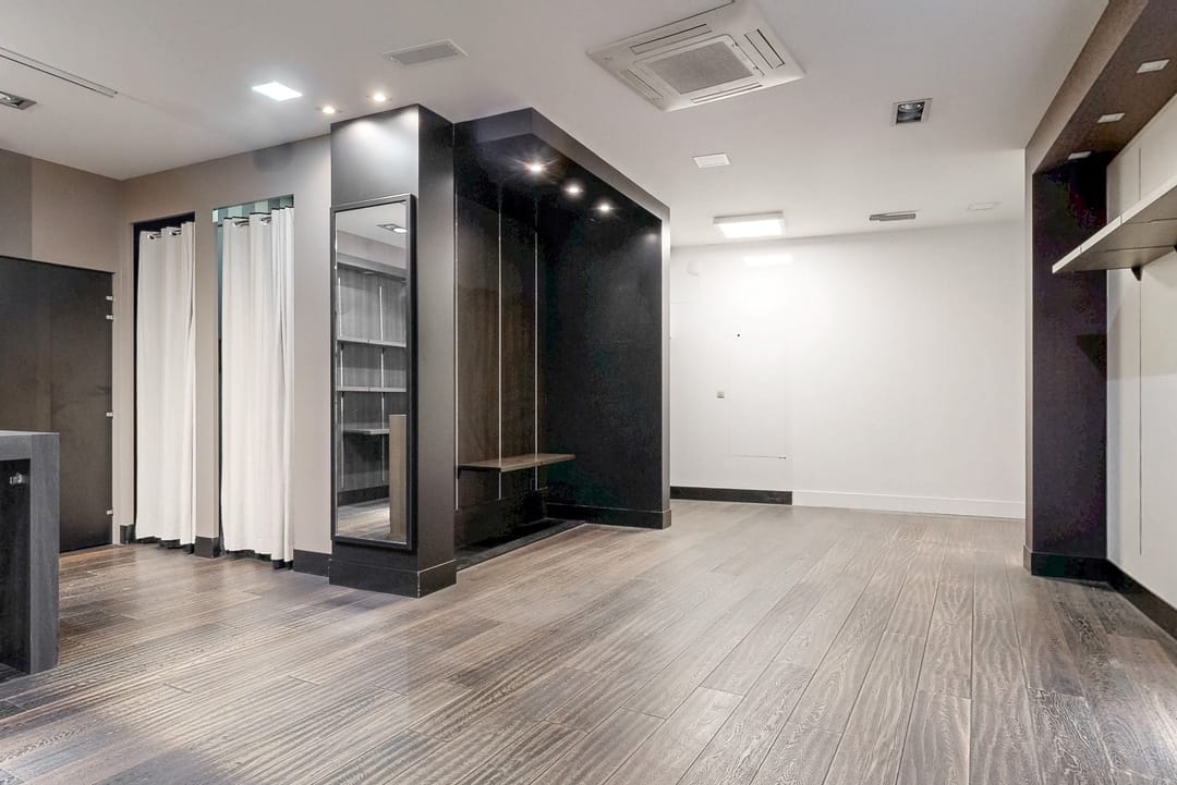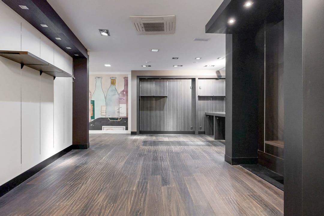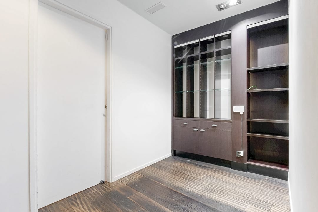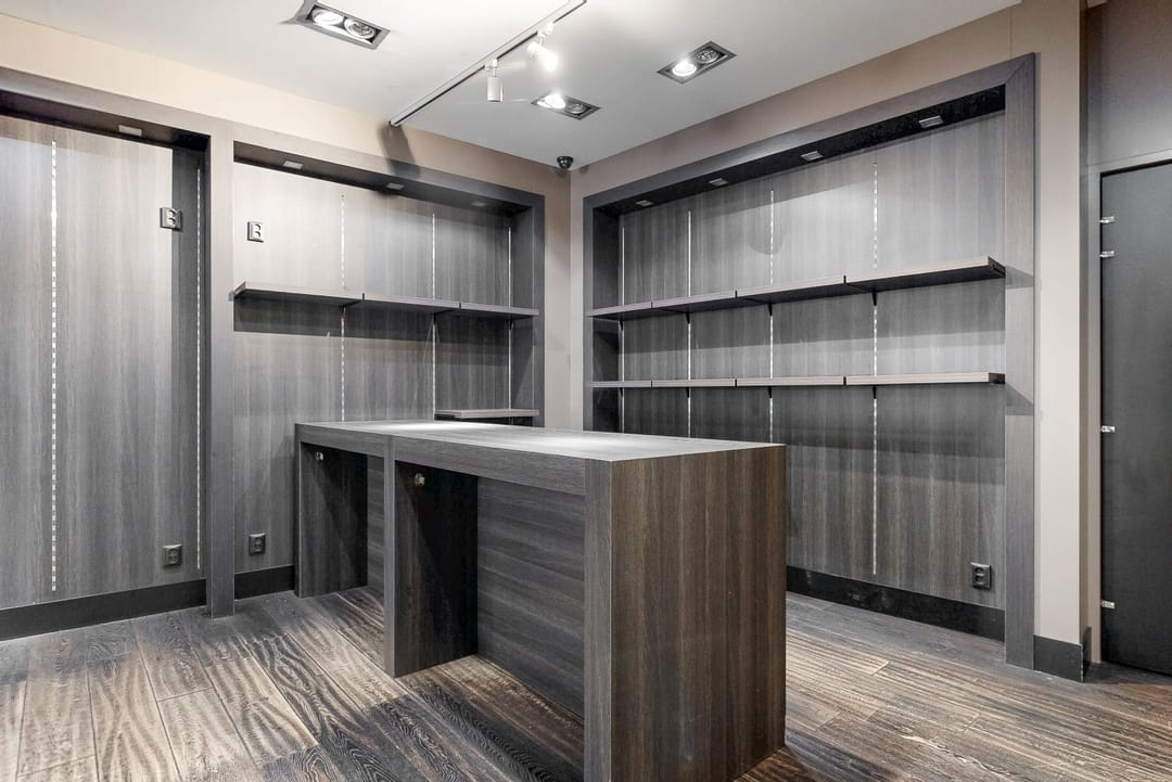De winkel is luxe afgewerkt en beschikt over veel vaste kasten.