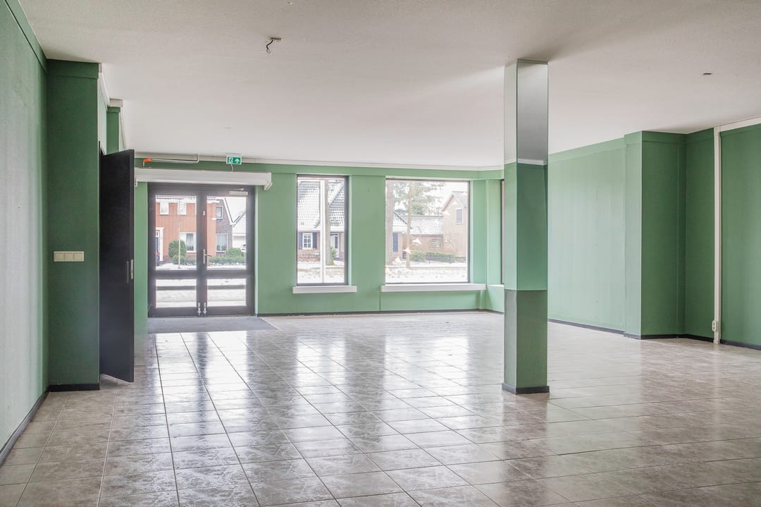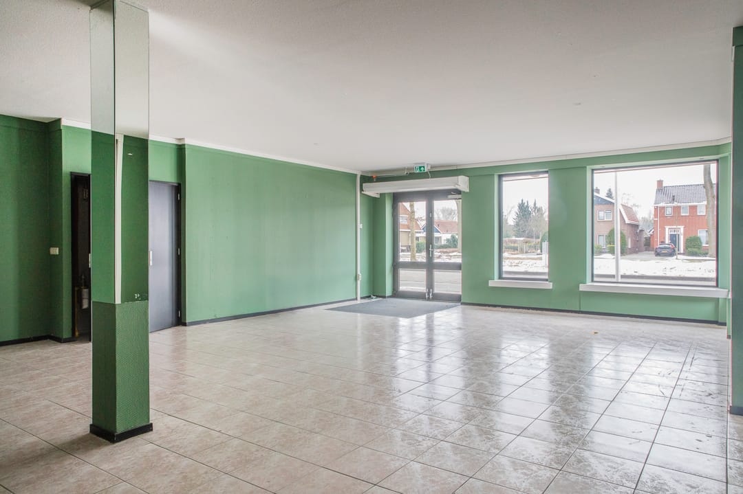 Entree (frontbreedte circa 630 cm), winkel (circa 93 m²), doorgang naar kelder, berging, toilet en keuken/kantine.