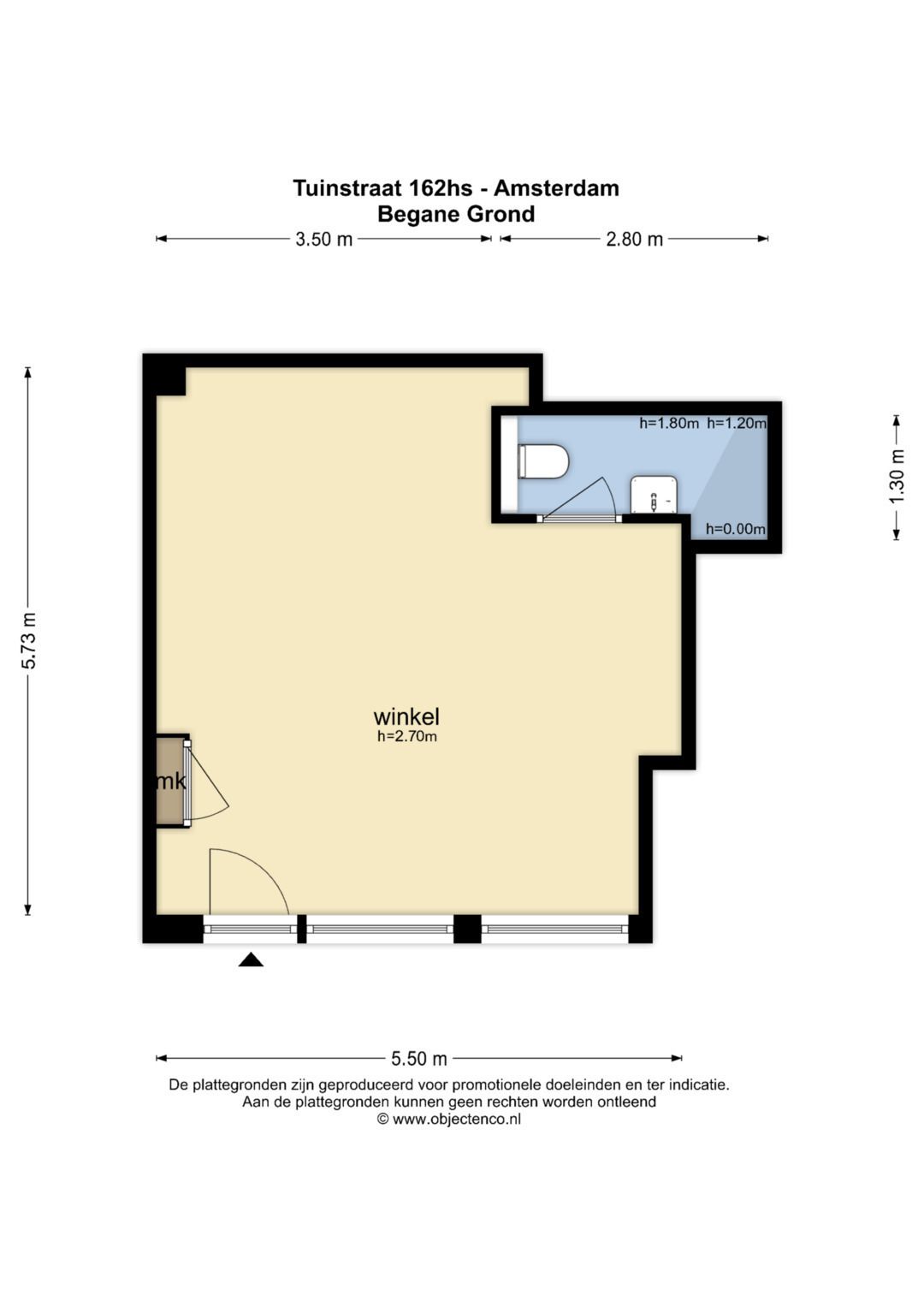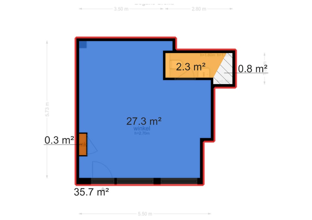 Entreedeur, twee grote ramen aan de straatzijde, frontbreedte 550cm en plafondhoogte 270cm.