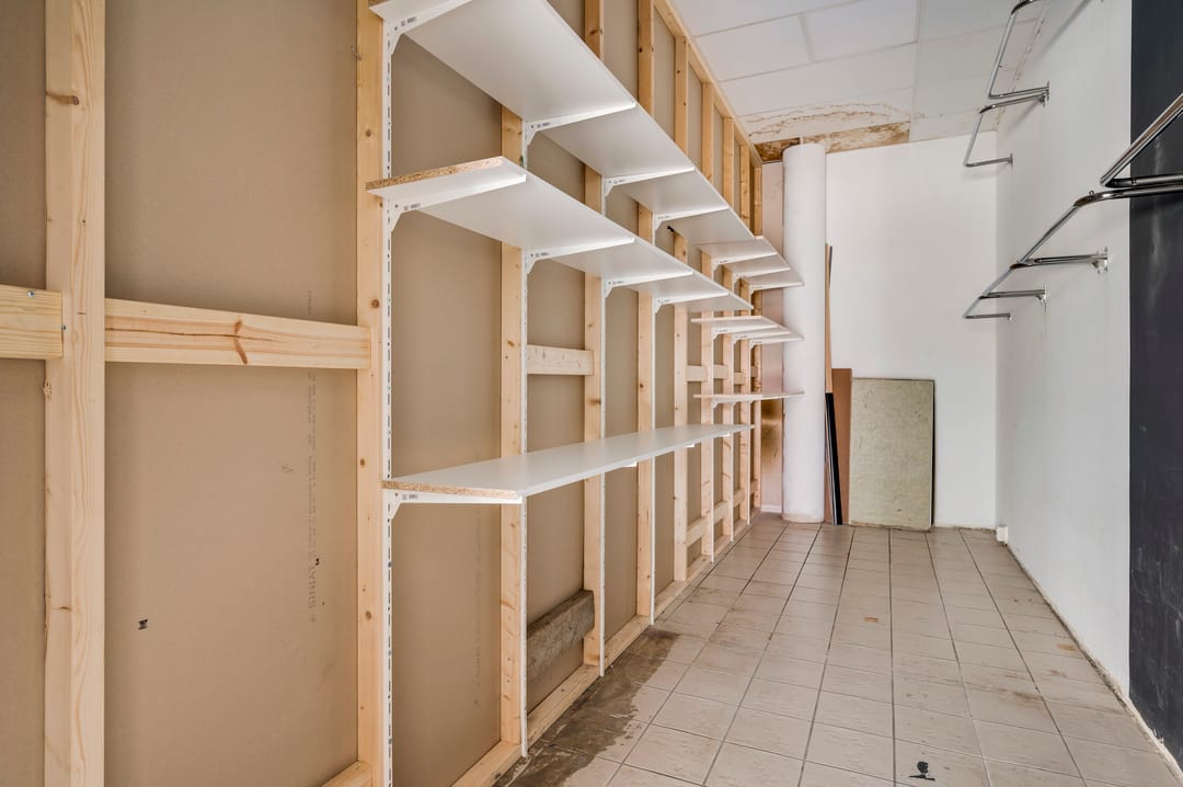 This retail space is practically laid out and neatly finished with a laminate floor and suspended ceiling with LED lighting. On the right-hand side are two fitting rooms, with a storage room and pantry located behind them. On the left side of the space is the counter with two enclosed rooms behind it, including the meter cupboard and the central heating system. A separate toilet room is also present.