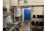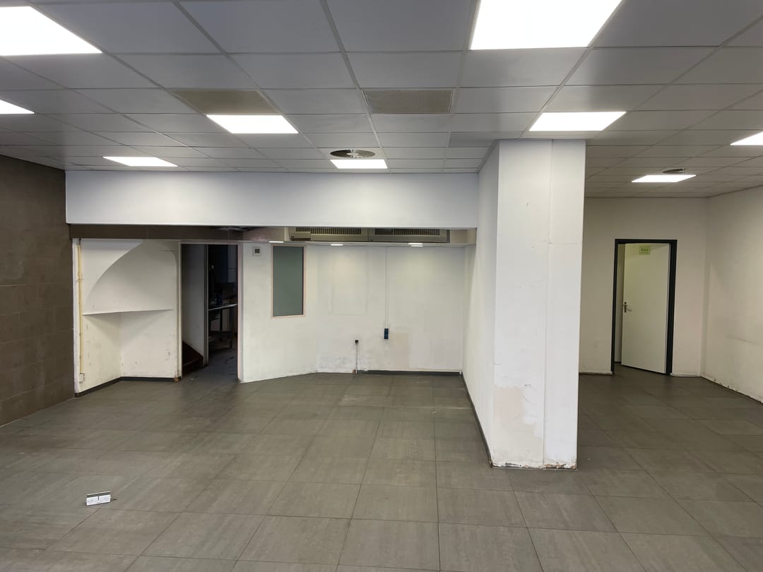 Met de huidige indeling bevindt zich halverwege een tussenwand met daarachter een ruimte met onder andere een toilet, koelcabine een trap naar een tussenvloer met technische installaties. Vóór deze tussenwand bevindt zich de winkelruimte met een verlaagd plafond inclusief afzuiginstallatie en nog 2 separate extra toiletten.