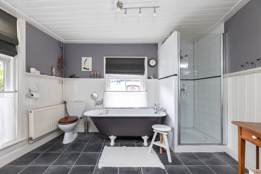 - Sfeervolle badkamer voorzien van een vrijstaand, gietijzeren bad, een separate douchehoek en een toilet (type duo blok).