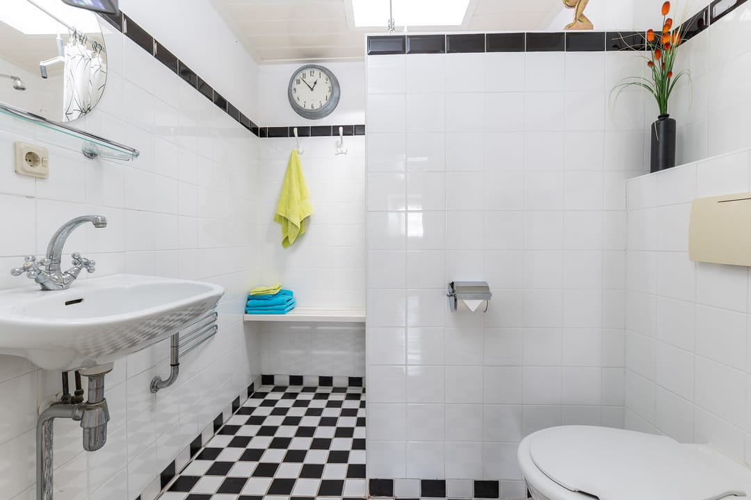- Lichte, gezellige badkamer voorzien van een daglichtkoepel, een douchehoek, wastafel en toilet (type hangtoilet).
