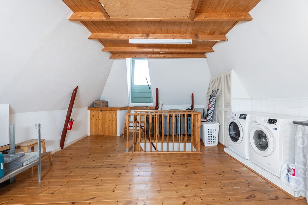 - De ruimte is fraai afgewerkt met een houten lambrisering en houten accenten.