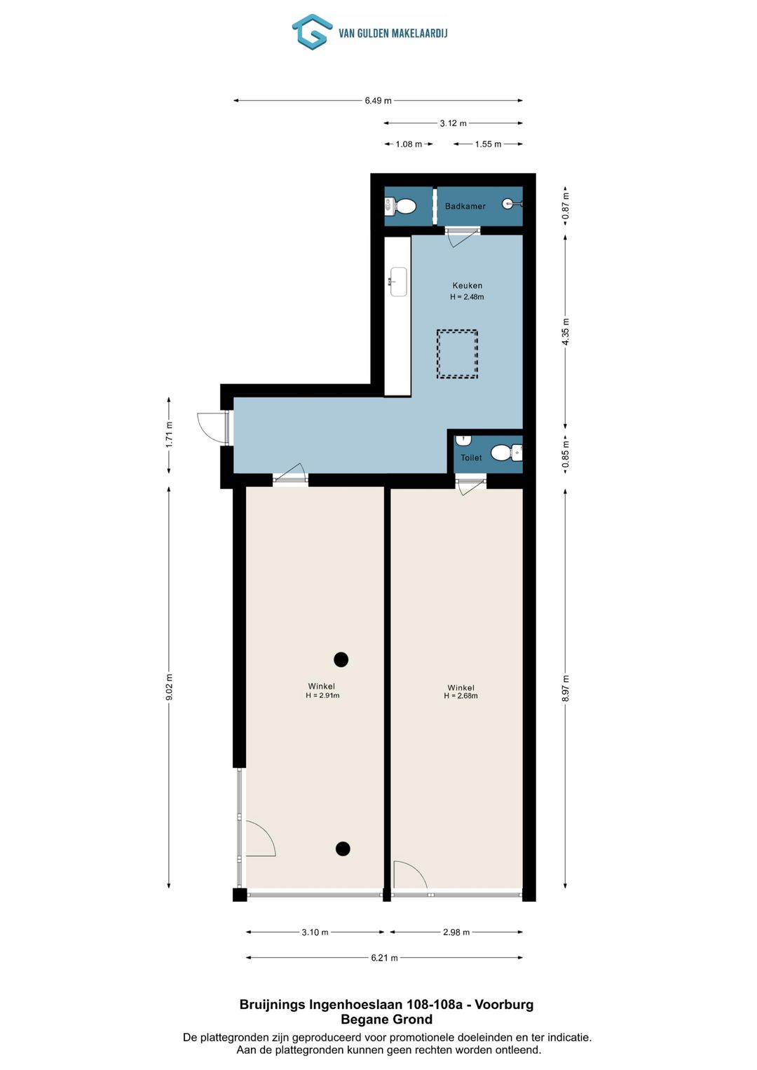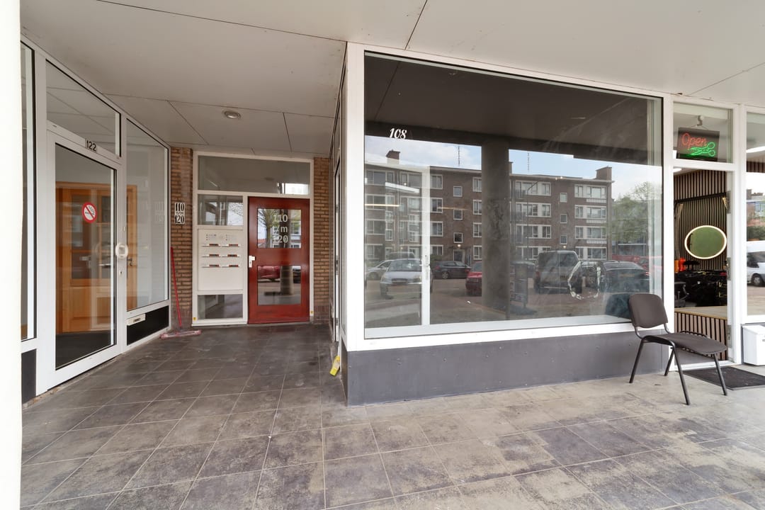 Nummer 108A betreft een winkelruimte met achtergelegen opslag en toegang tot een poort, wat ideaal is voor laden en lossen. De ruimte is praktisch ingedeeld en beschikt over een eenvoudige keuken en een toilet, waardoor deze geschikt is voor diverse vormen van detailhandel of dienstverlening.