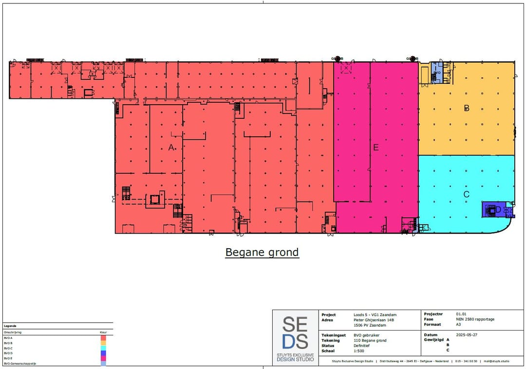 - Totale oppervlakte: ca. 2.194 m² BVO op de begane grond (ruimte E)