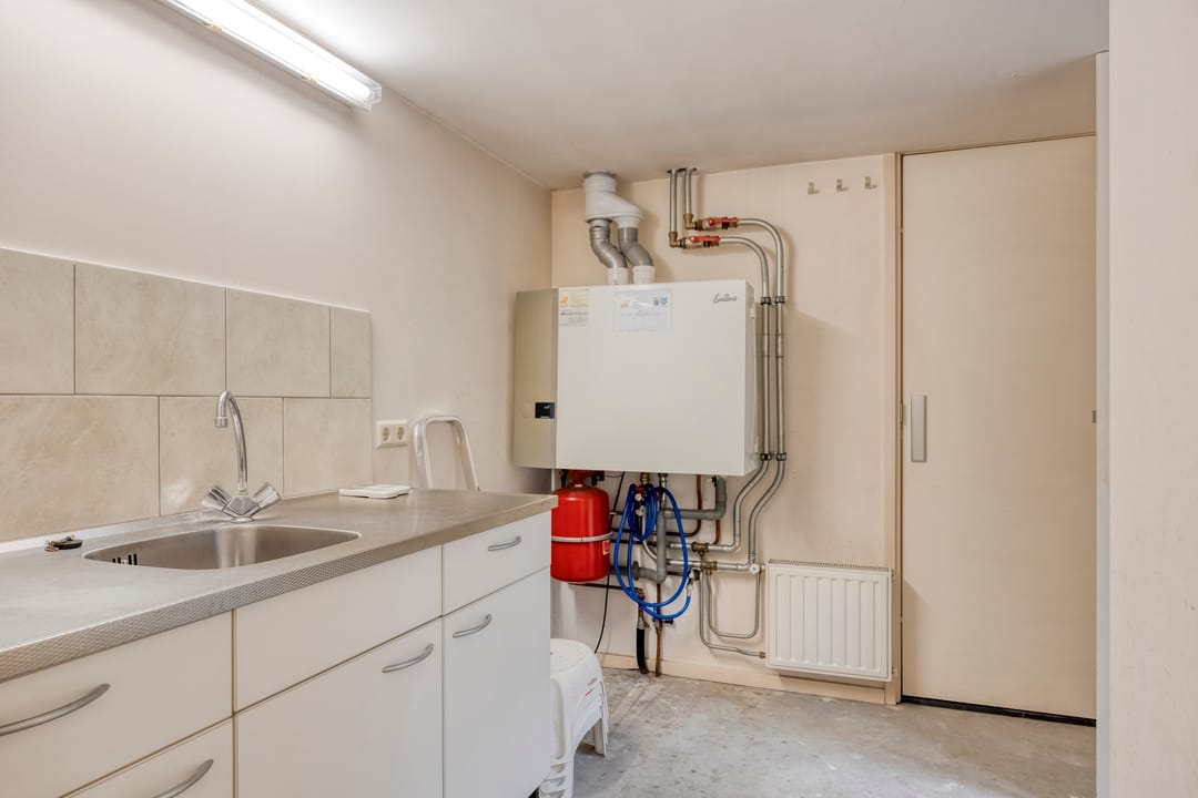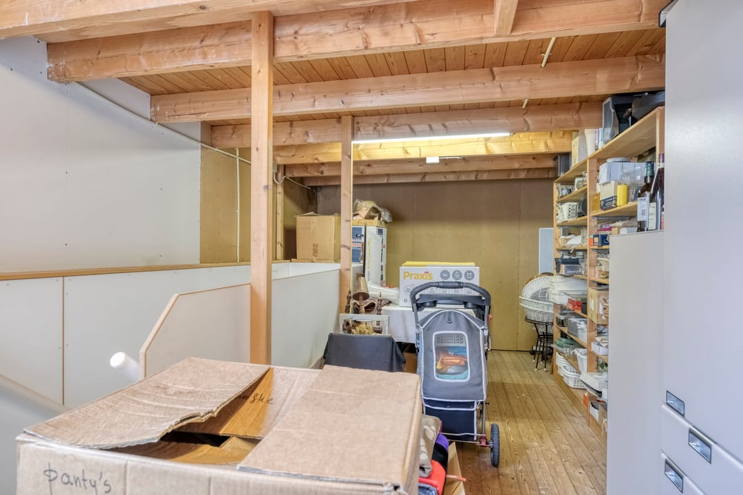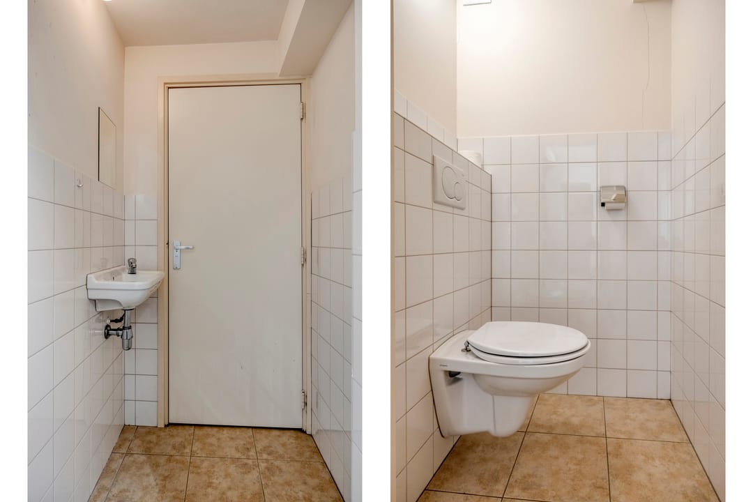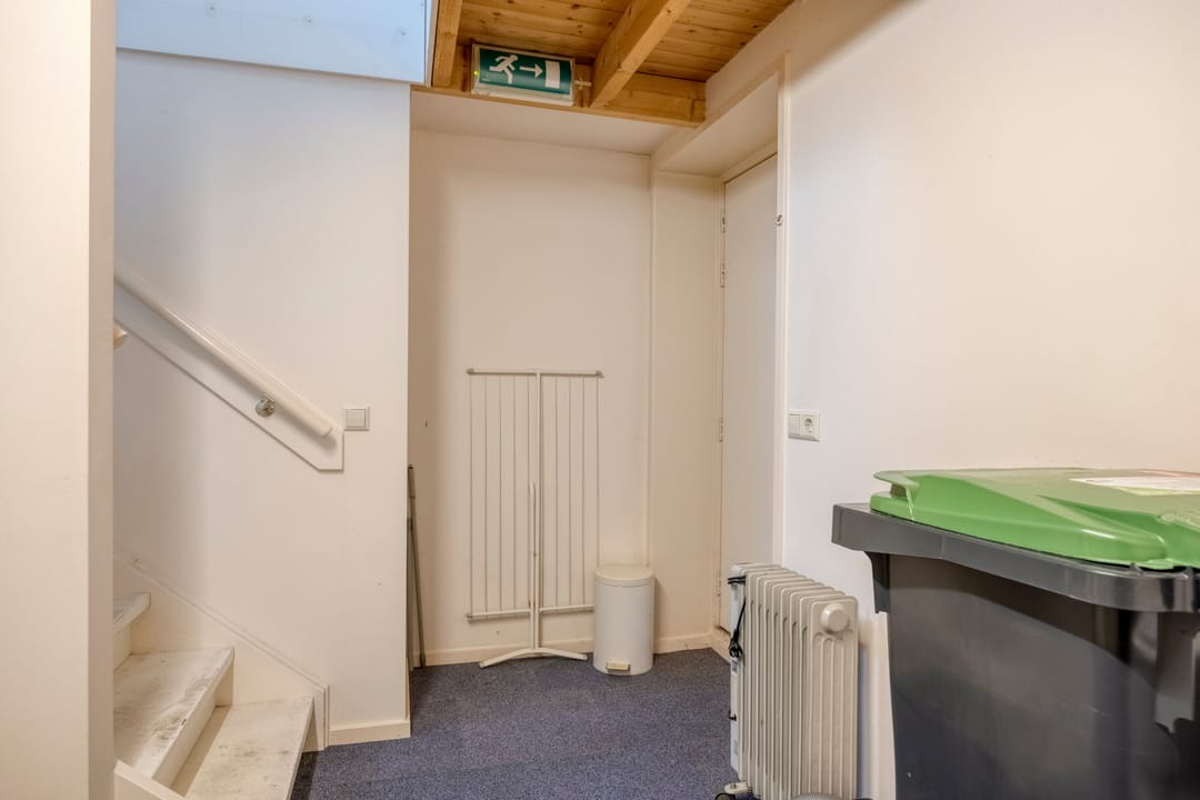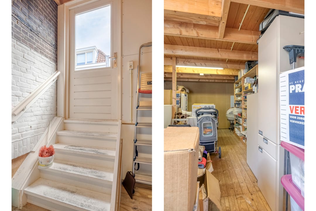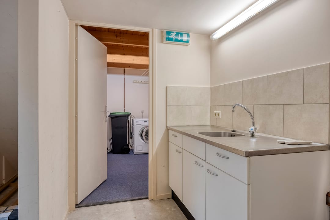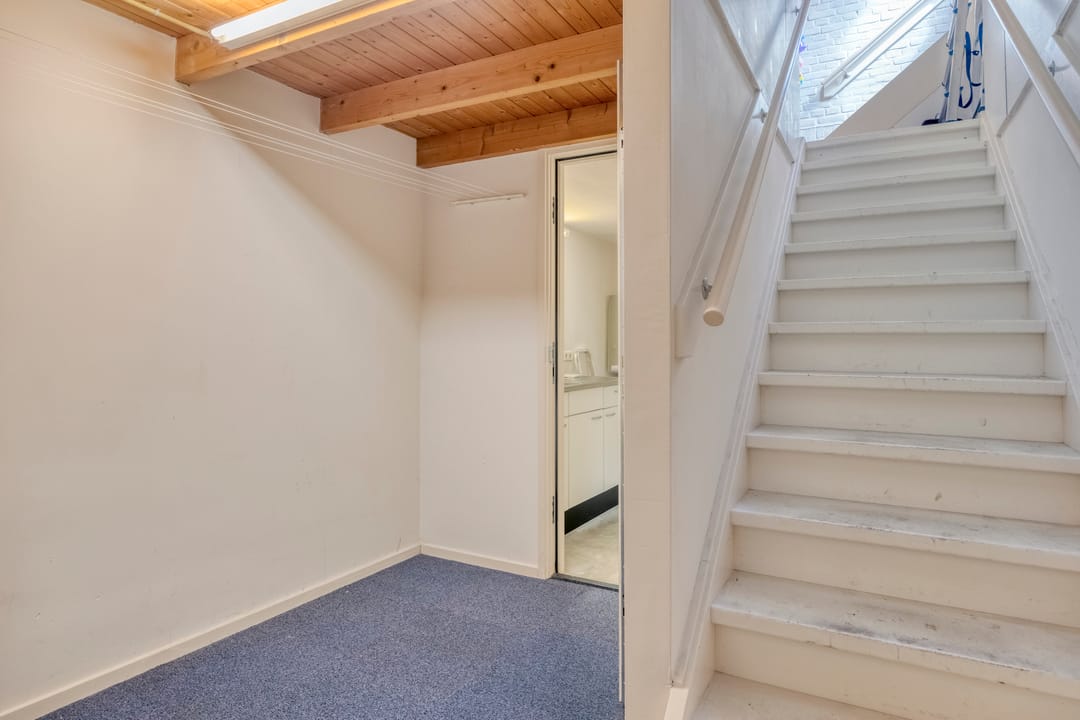 Achter in de winkel is een ruim magazijn en pantry met een eenvoudig keukenblok met gootsteen en een toiletruimte. Via een vaste trap is de berging bereikbaar, deze ruimte biedt extra mogelijkheden voor een winkel.