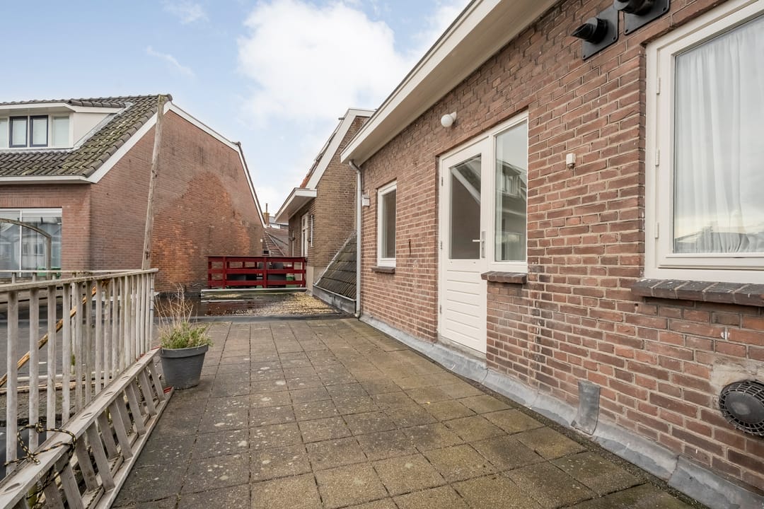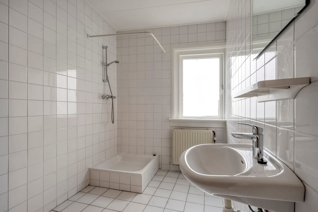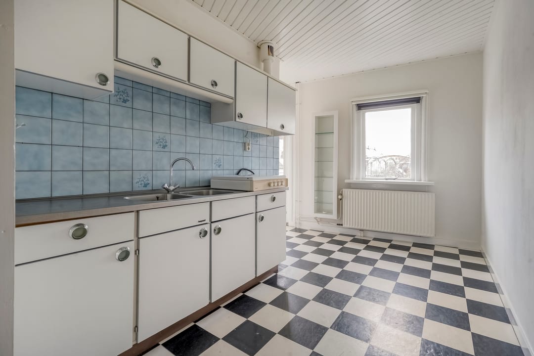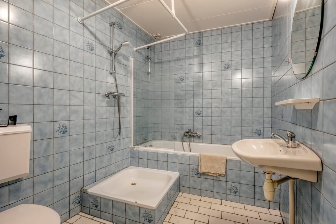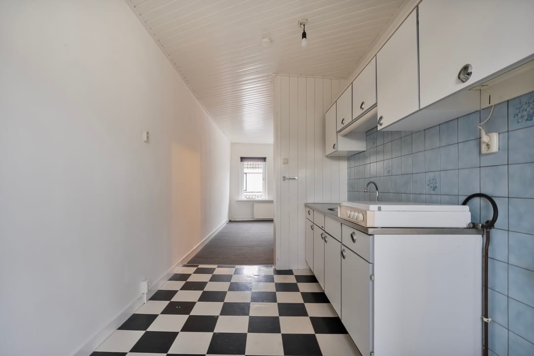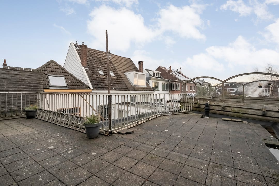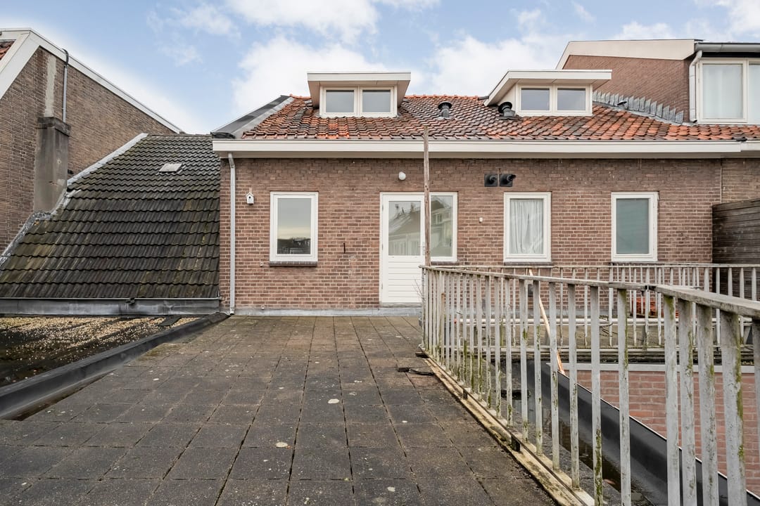 2. Woning: op de 1e verdieping bestaande uit een halletje, woonkamer met open keuken, toegang tot royaal dakterras, badkamer v.v. bad, douche, wastafel en toilet