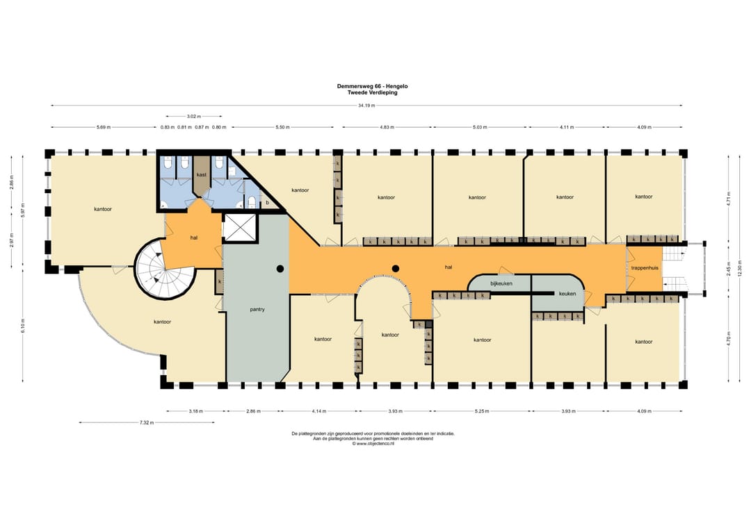 De oppervlakten zijn gemeten door verhurend makelaar uit een kopie bouwtekening. Het opgegeven metrage is derhalve indicatief; er kunnen geen rechten aan worden ontleend noch kan er sprake zijn van enige verrekening achteraf.